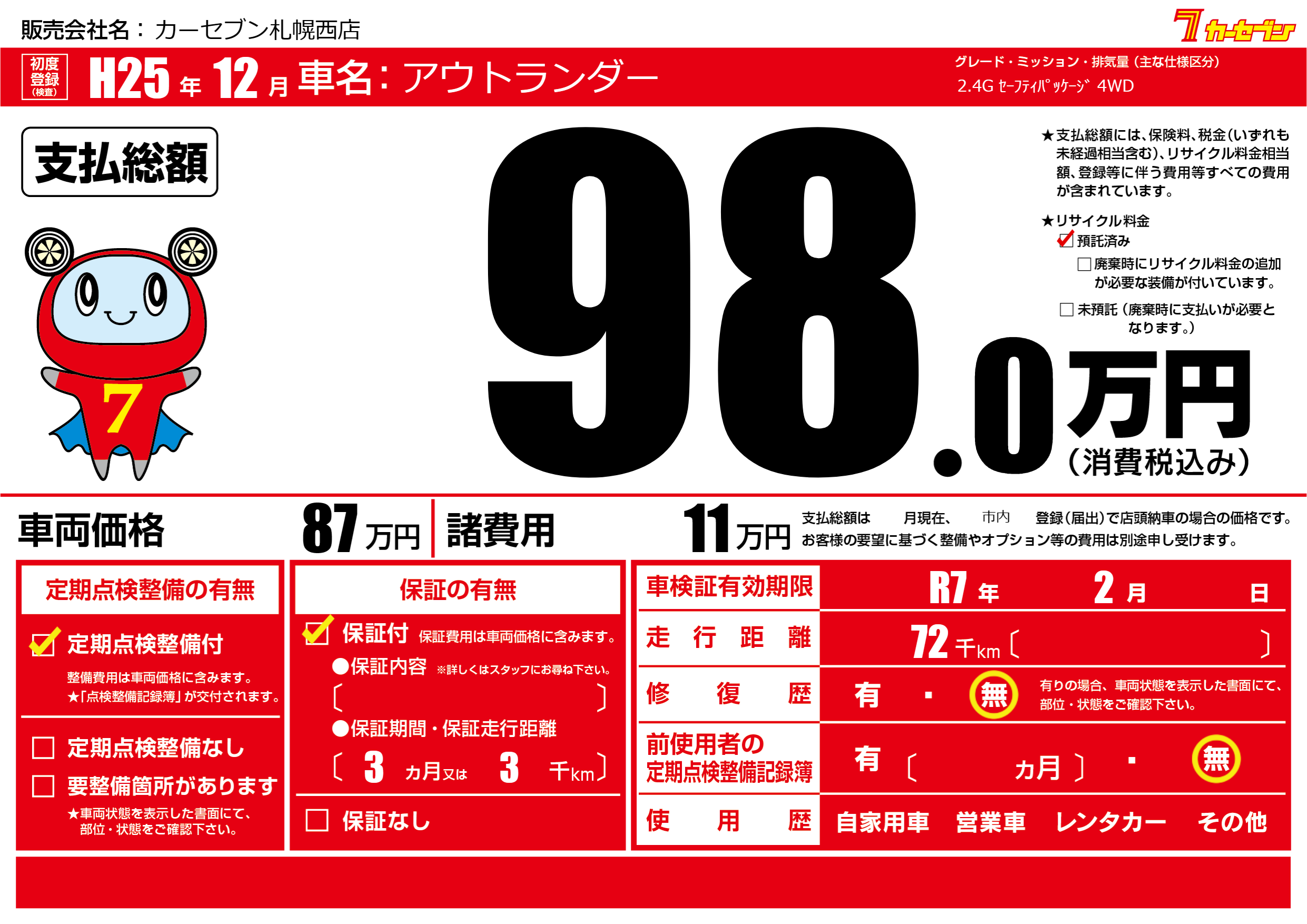 | 走行キロ | 7.2万km | 初年度登録 | H25年12月 |