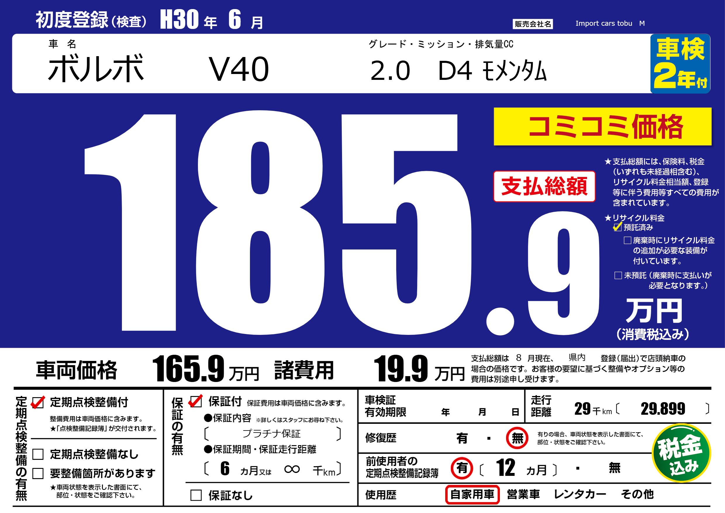 保証付き 保証内容( プラチナ保証) 6ヶ月または(∞)千kmまで |