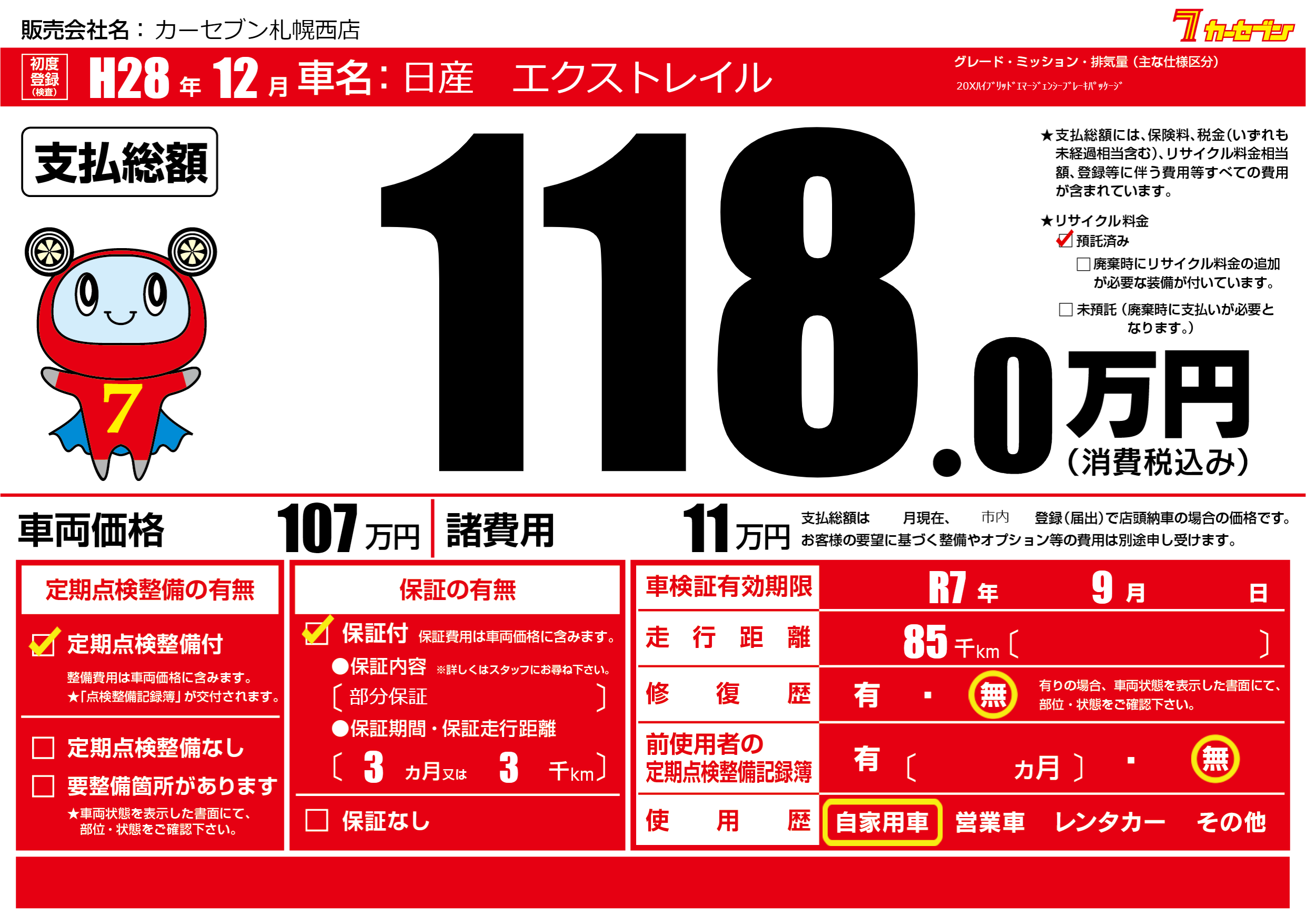 | 車名 | 日産 エクストレイル | グレード ミッション 排気量 |