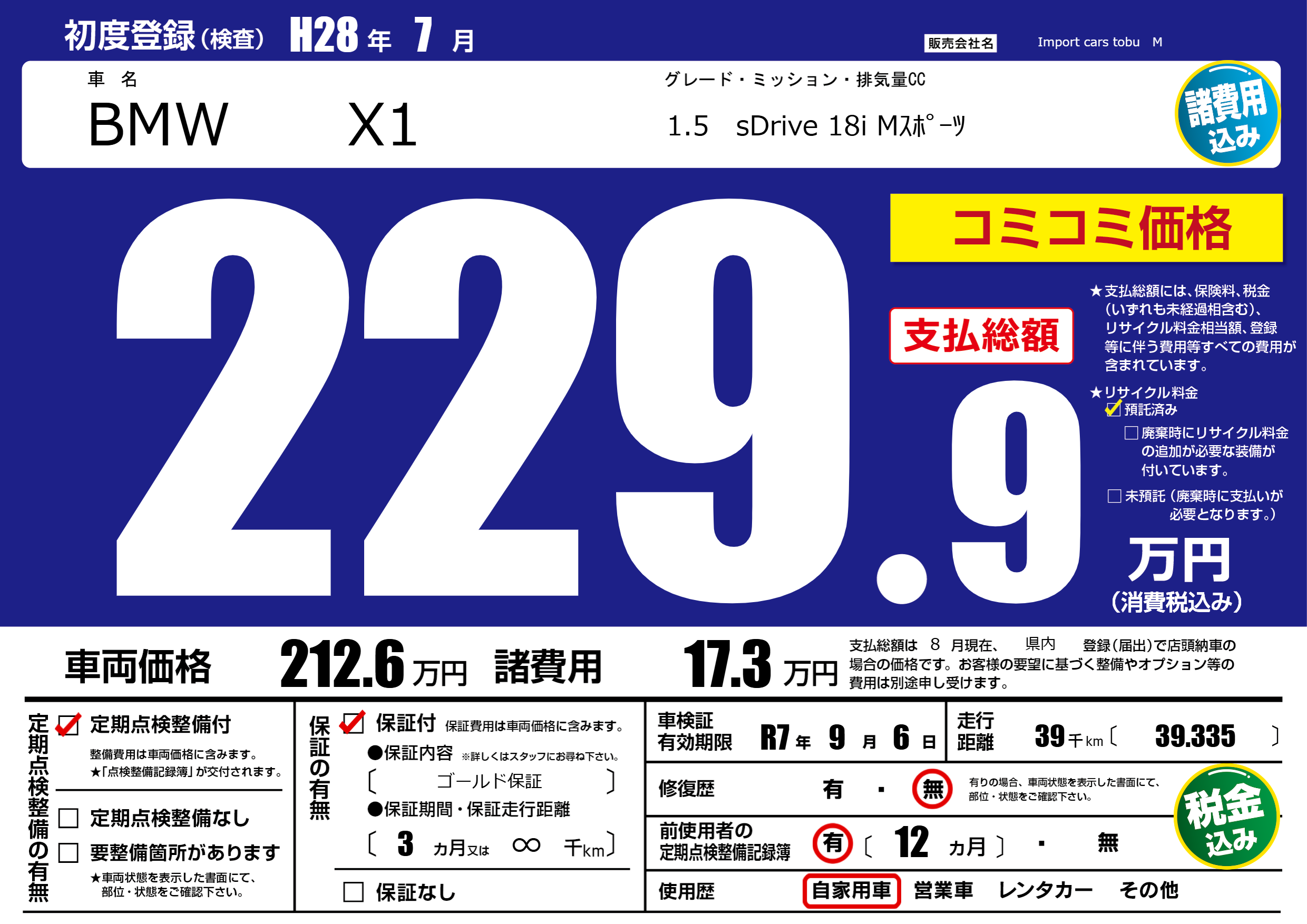 | 車検制限 | R7年 9月 6日 | ||