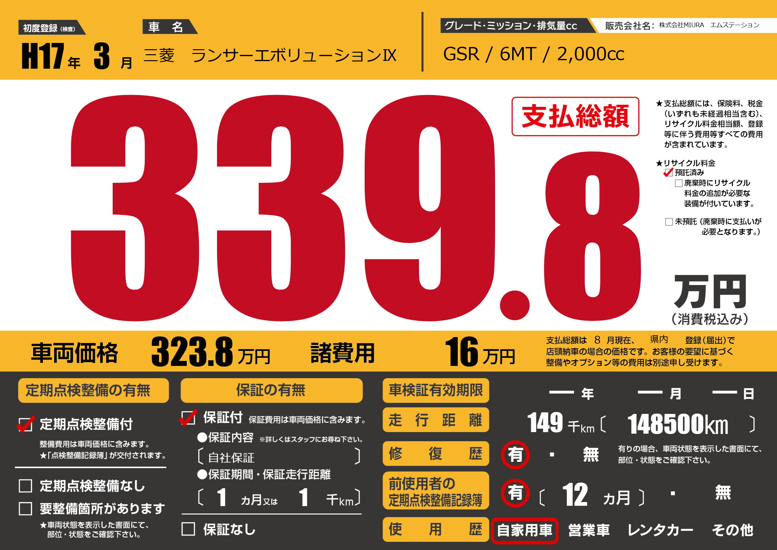 | 車名 | 三菱 ランサーエボリューションⅨ | グレード ミッション 排気量 |