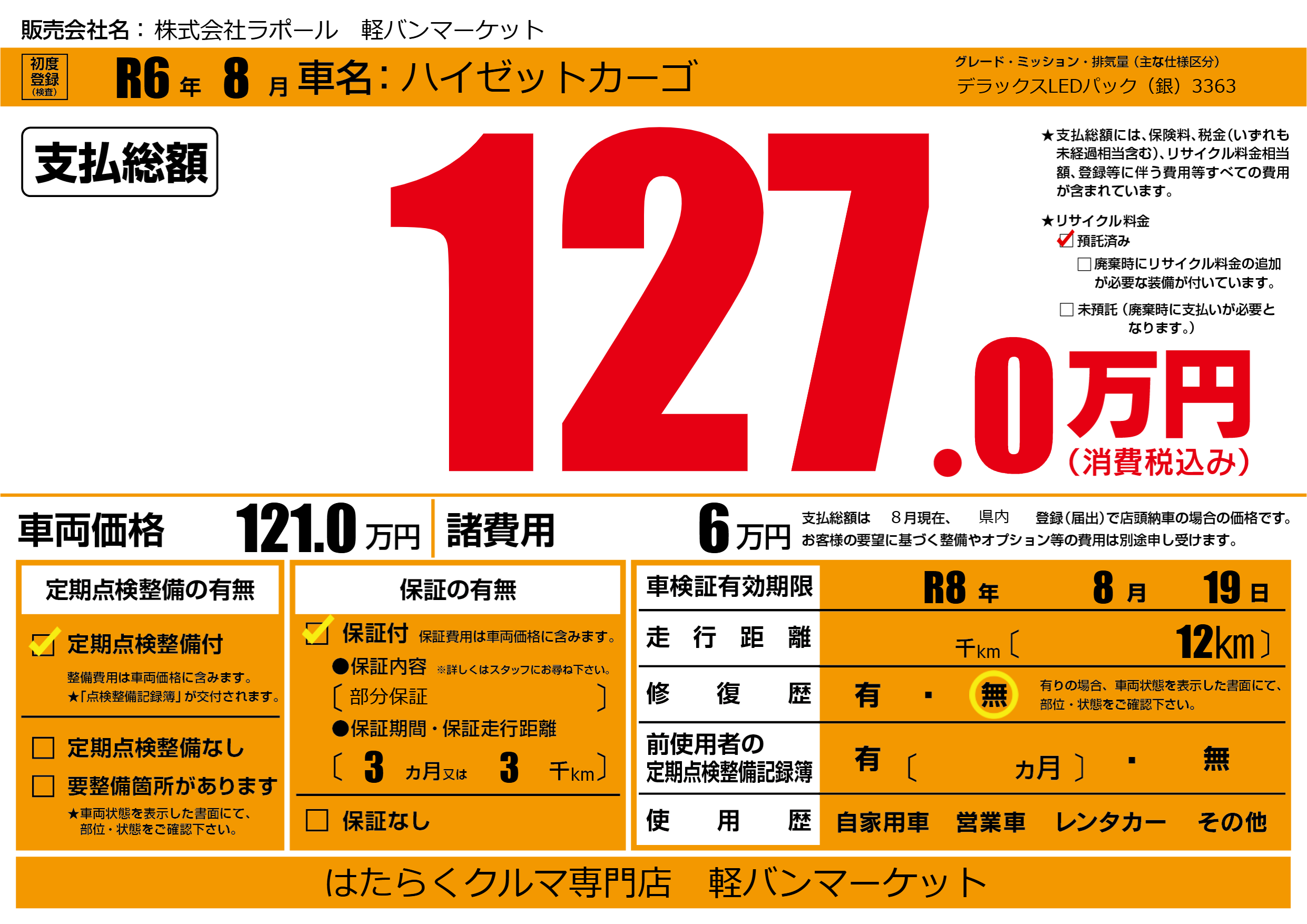 | 車名 | ハイゼットカーゴ | グレード ミッション 排気量 |