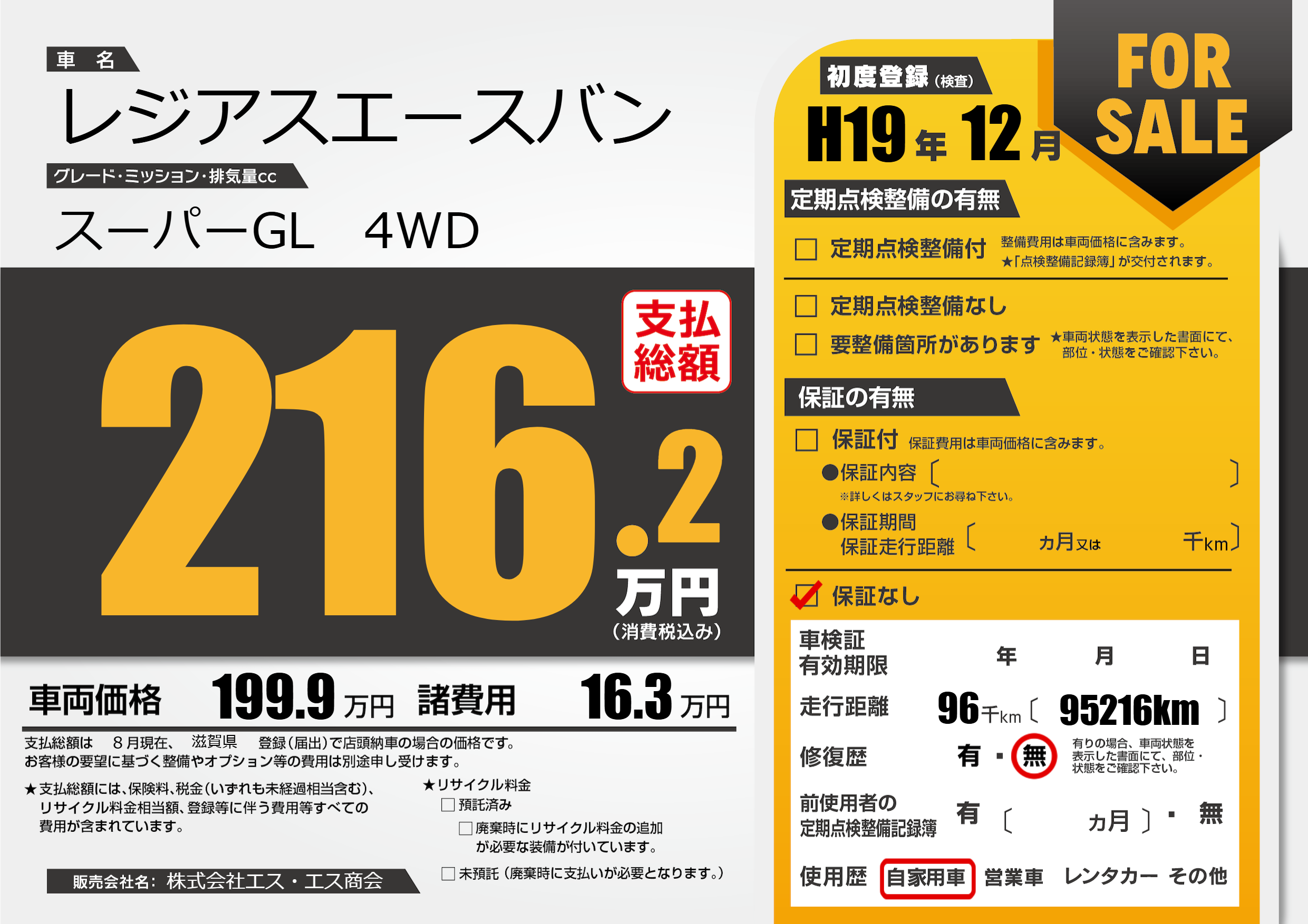 | 走行キロ | 9.6万km | 初年度登録 | H19年12月 |