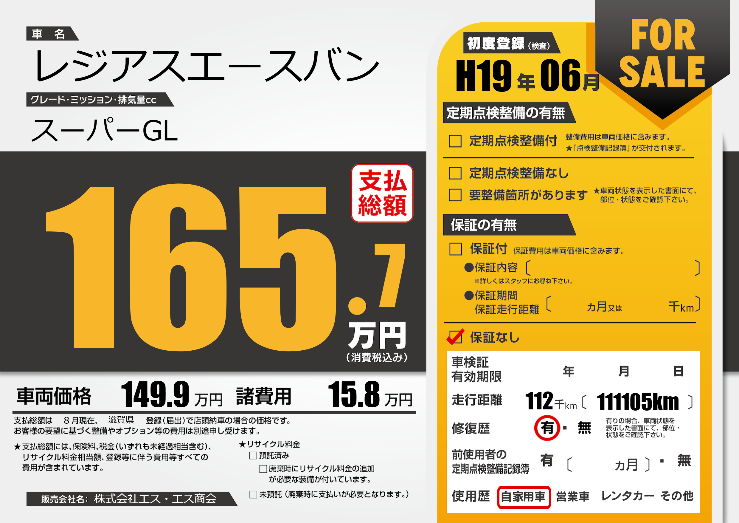 | 車名 | レジアスエースバン | グレード ミッション 排気量 |