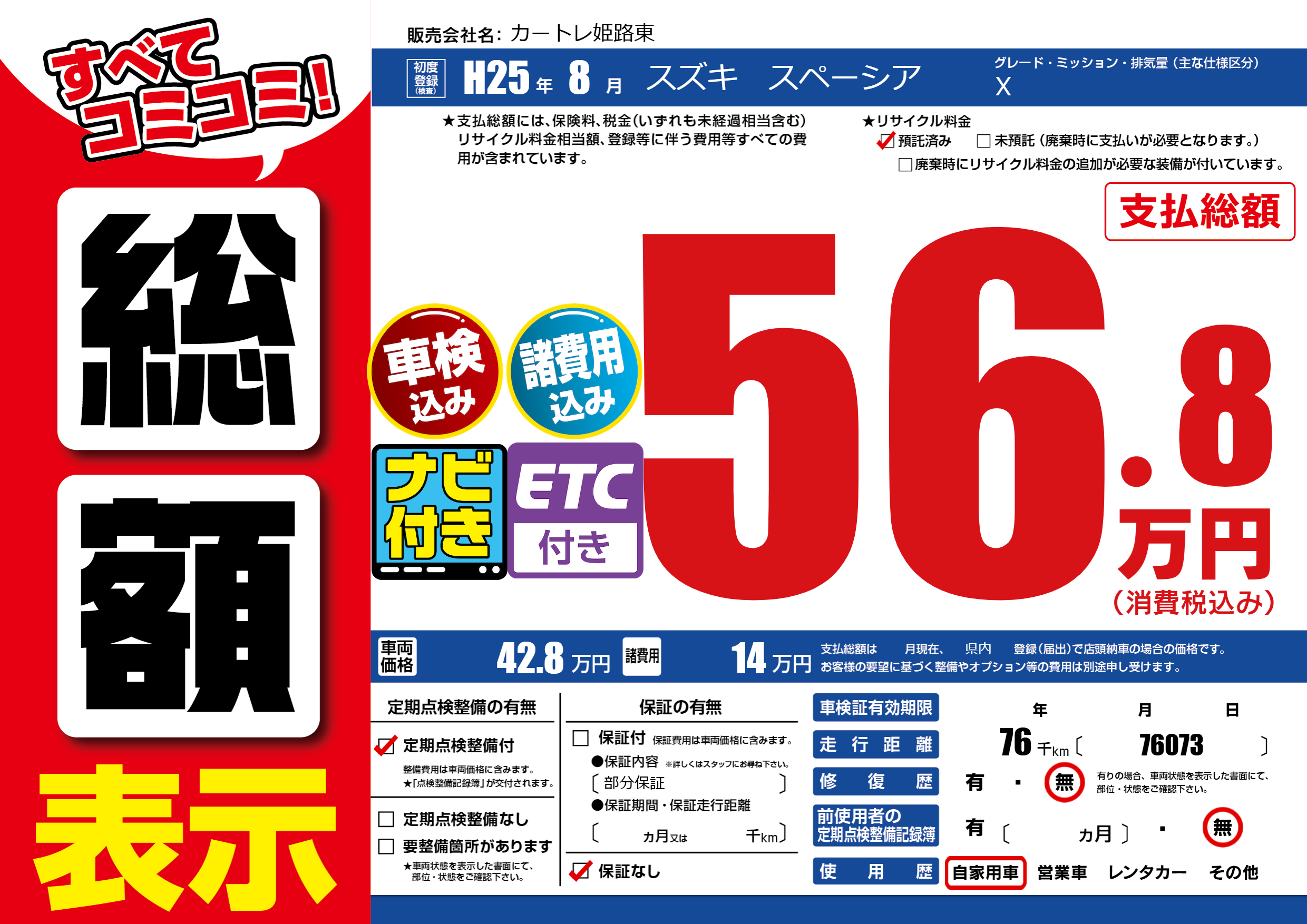 | 走行キロ | 7.6万km | 初年度登録 | H25年8月 |