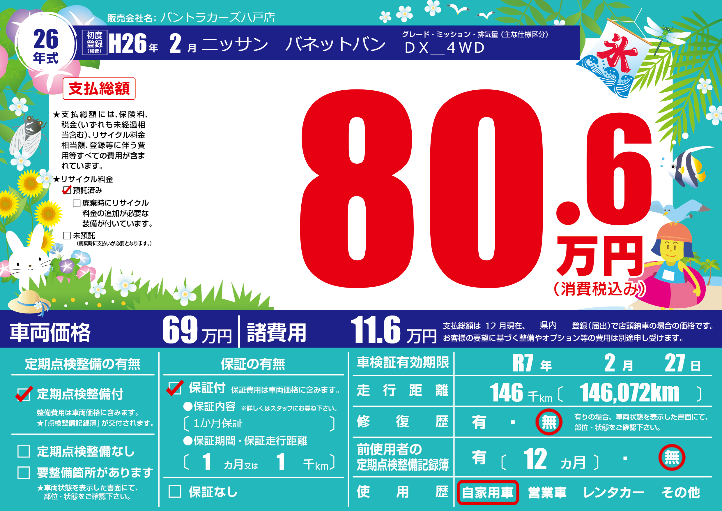 | 車名 | ニッサン バネットバン | グレード ミッション 排気量 |