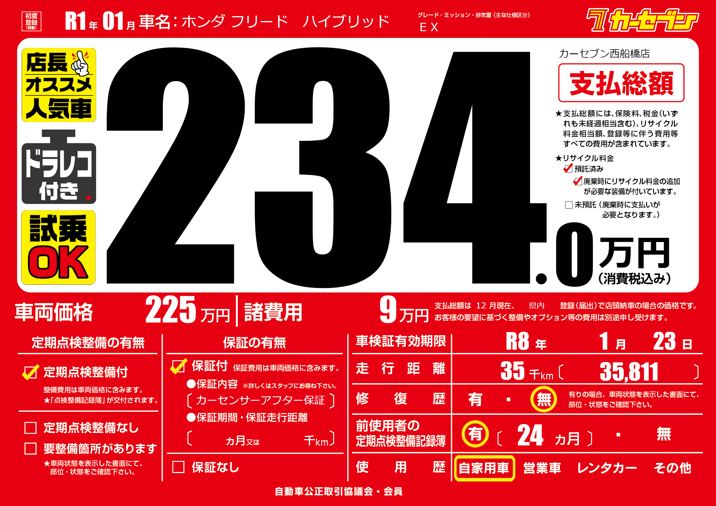| 車名 | ホンダ フリード ハイブリッド | グレード ミッション 排気量 |