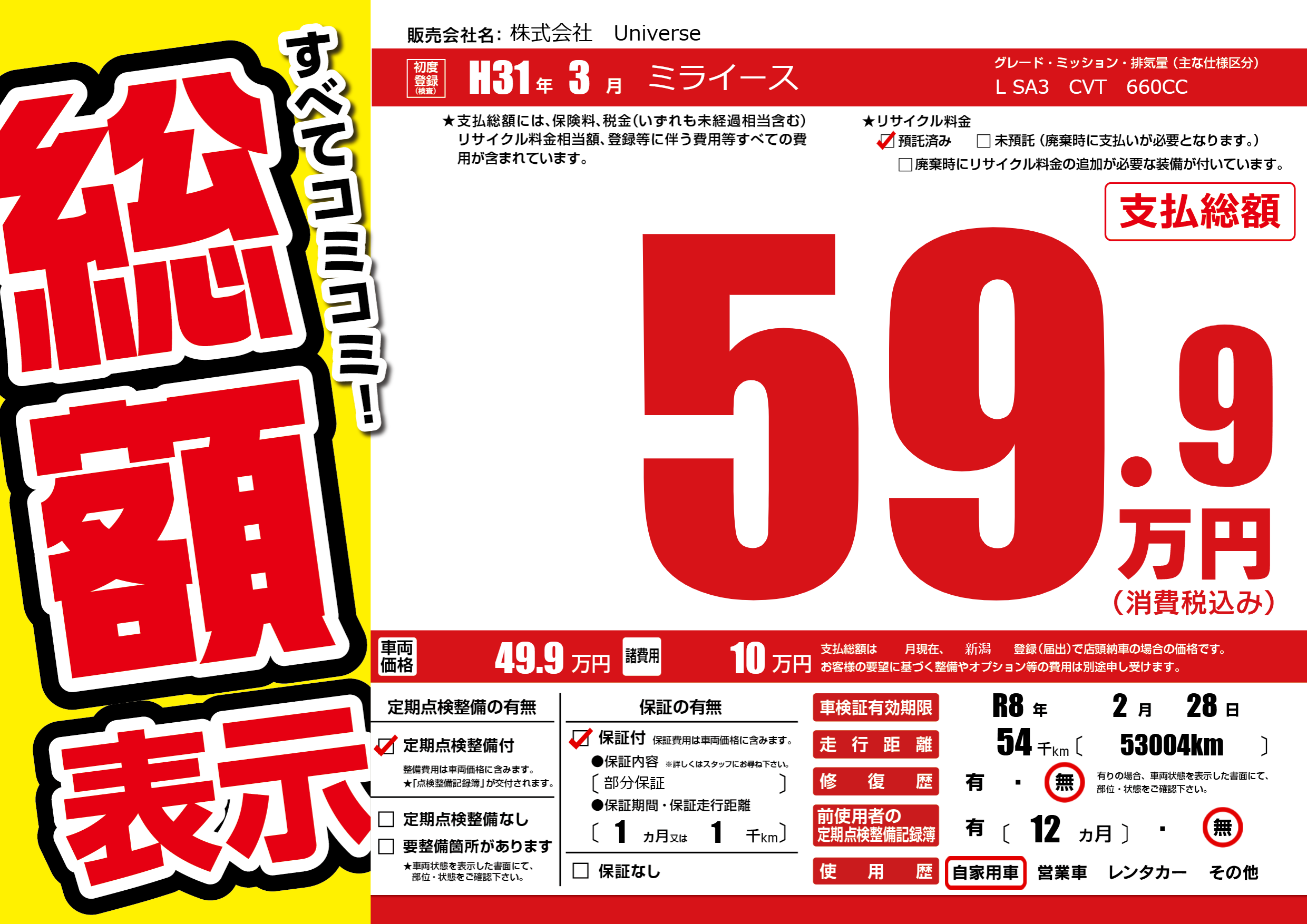 | 走行キロ | 5.4万km | 初年度登録 | H31年3月 |