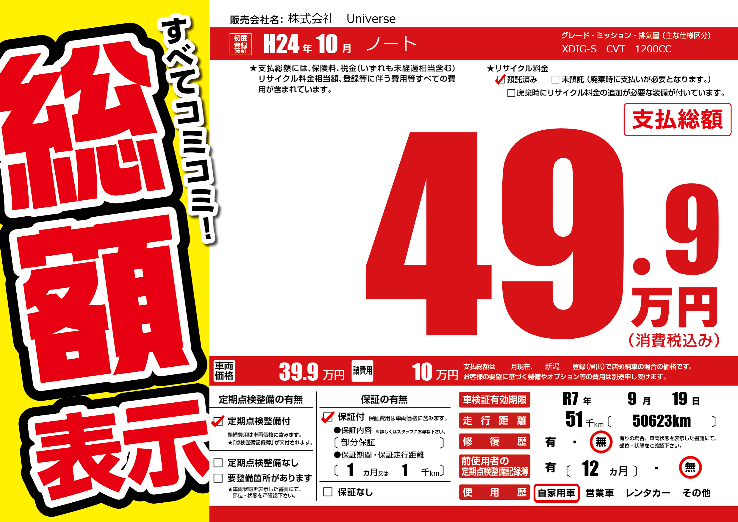 | 走行キロ | 5.1万km | 初年度登録 | H24年10月 |