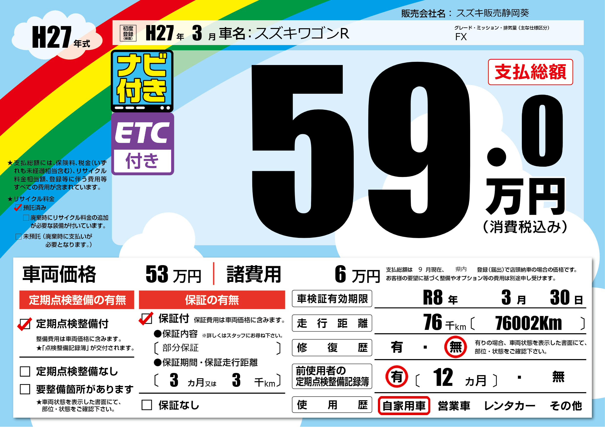 | 車名 | スズキワゴンR | グレード ミッション 排気量 |