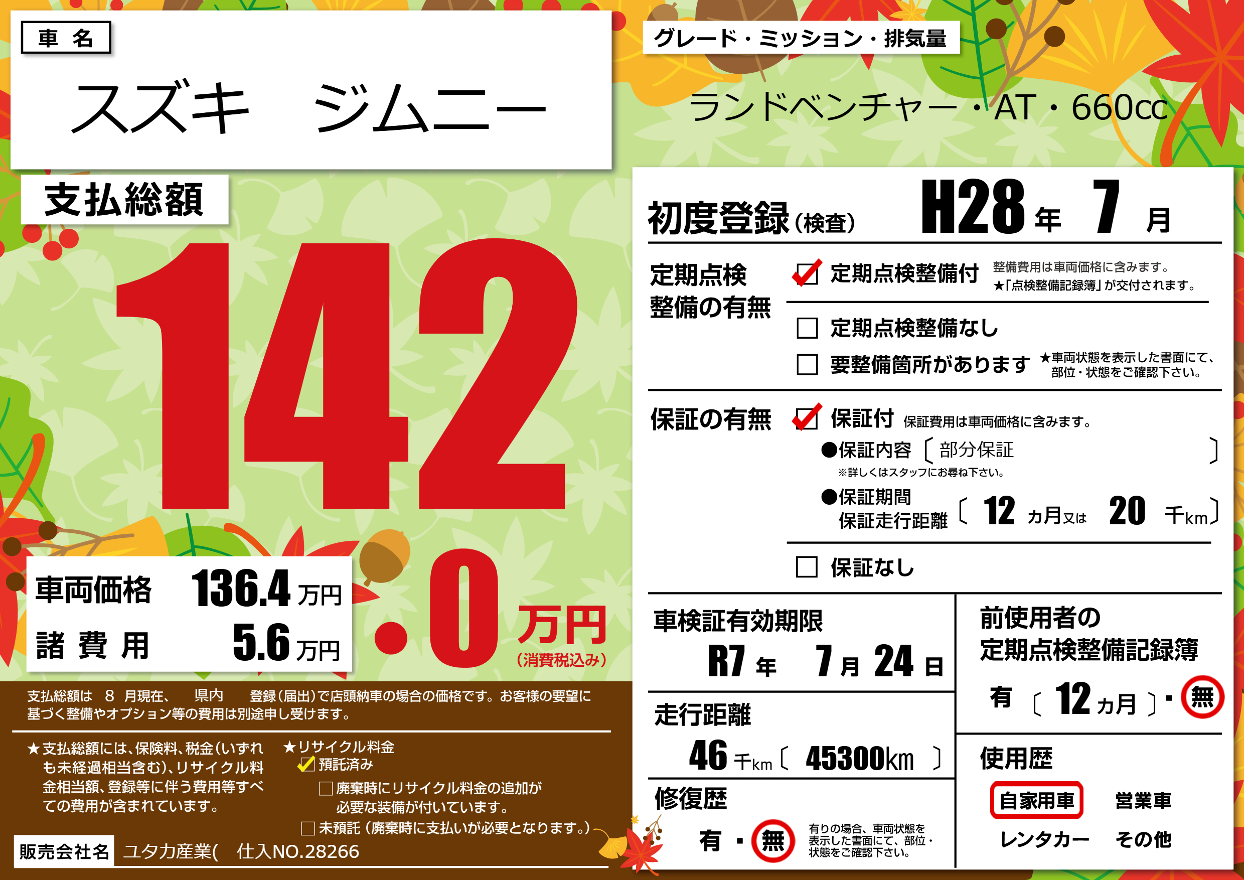 | 走行キロ | 4.6万km | 初年度登録 | H28年7月 |