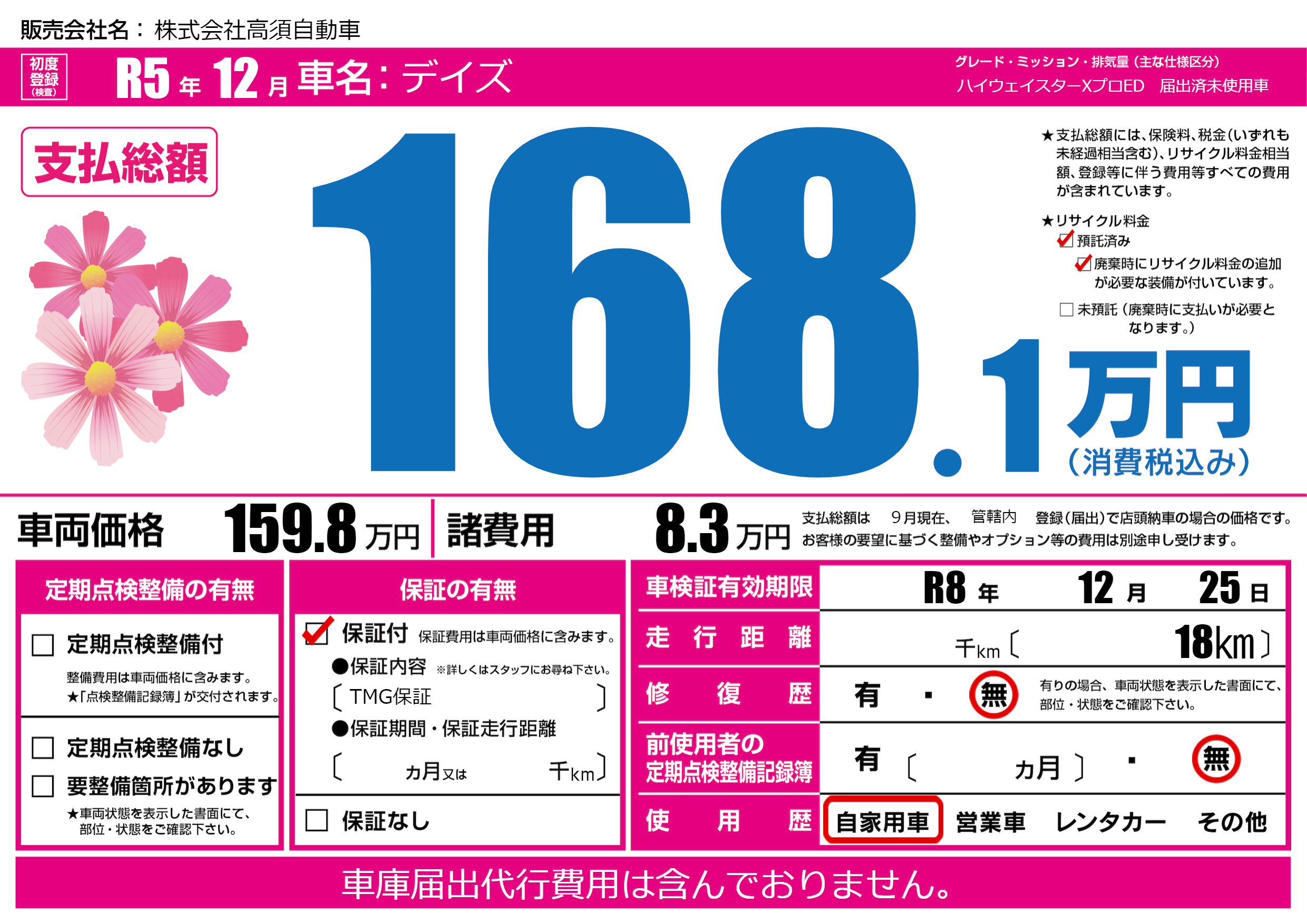 | 車名 | デイズ | グレード ミッション 排気量 |