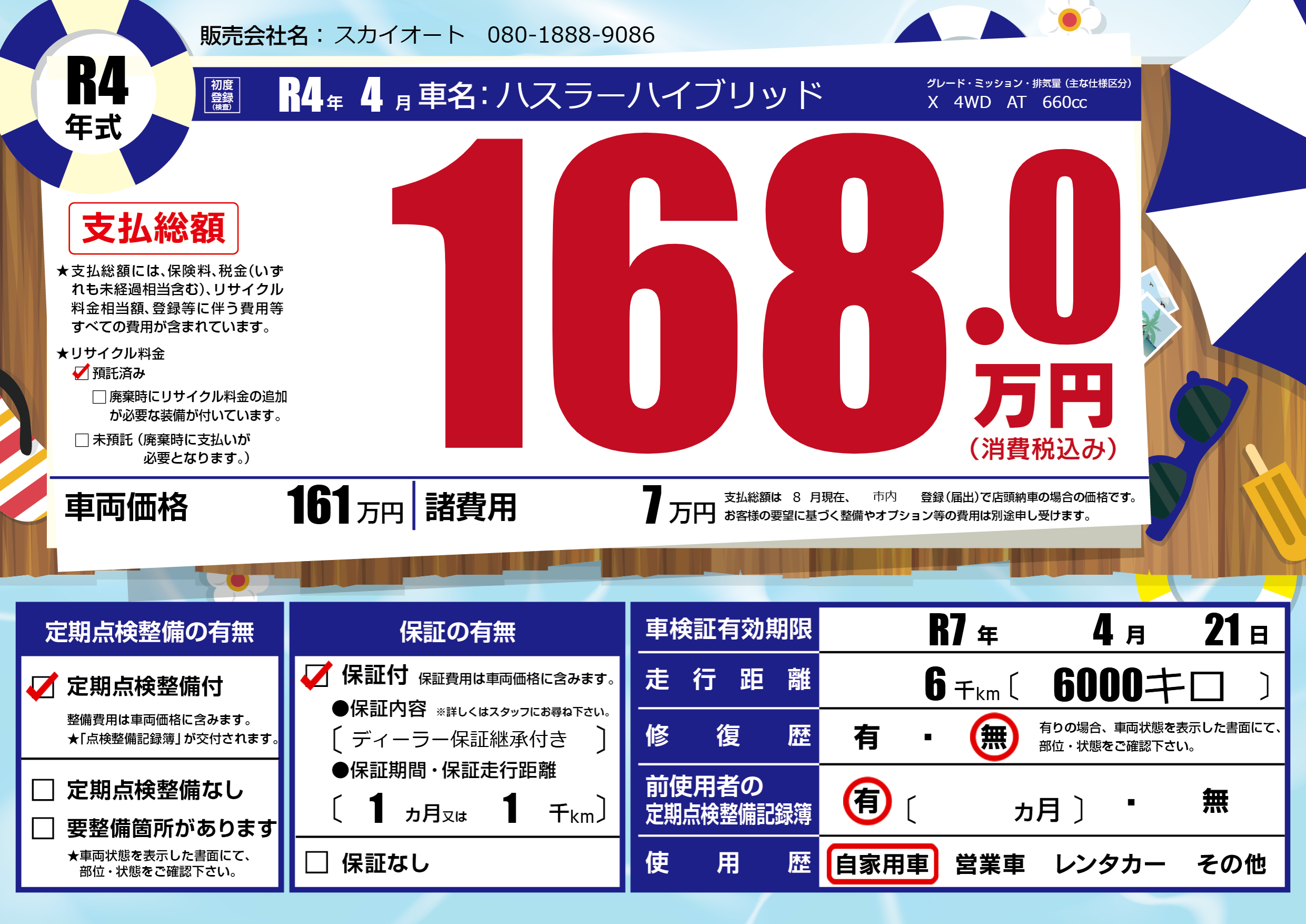 | 車名 | ハスラーハイブリッド | グレード ミッション 排気量 |