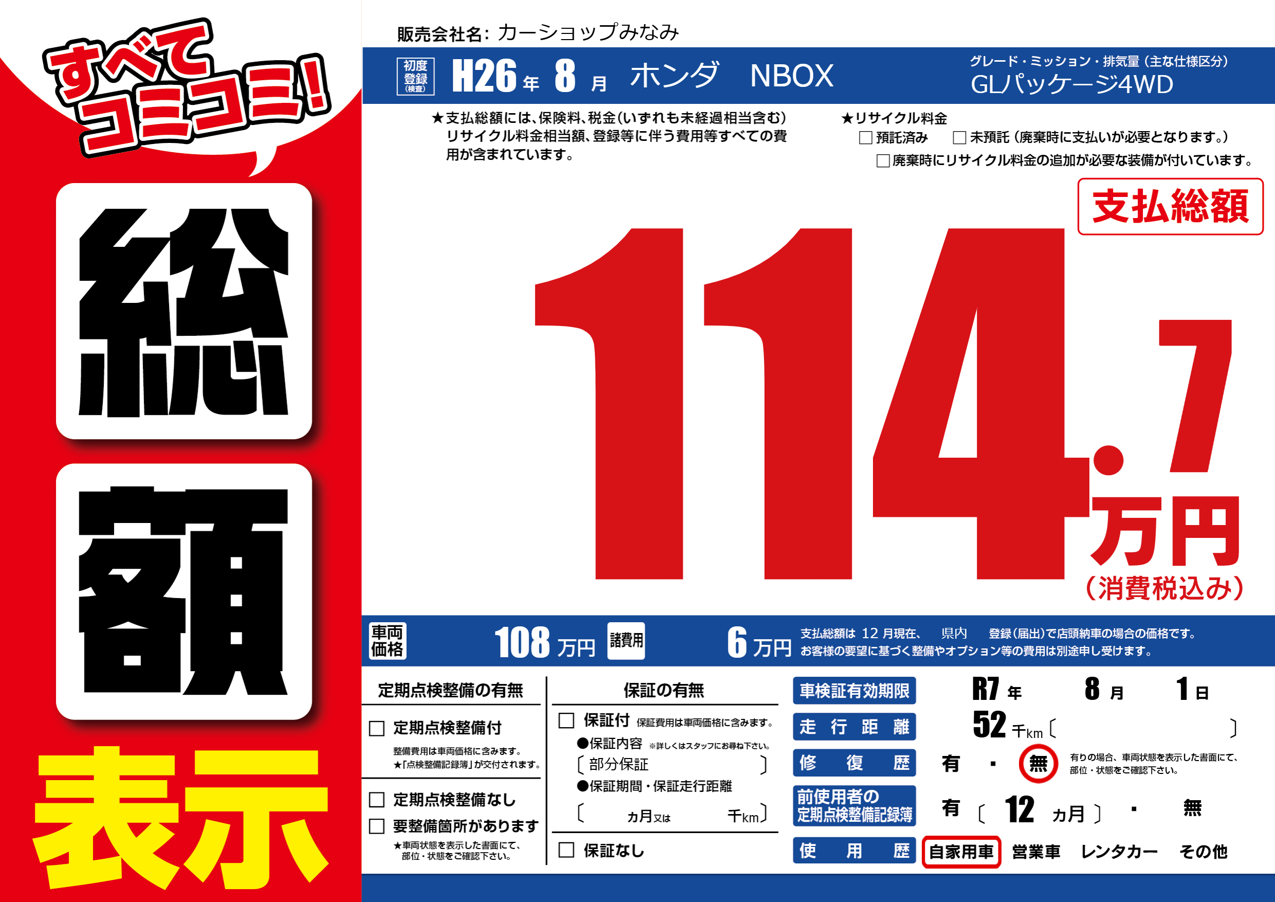 | 車名 | ホンダ NBOX | グレード ミッション 排気量 |