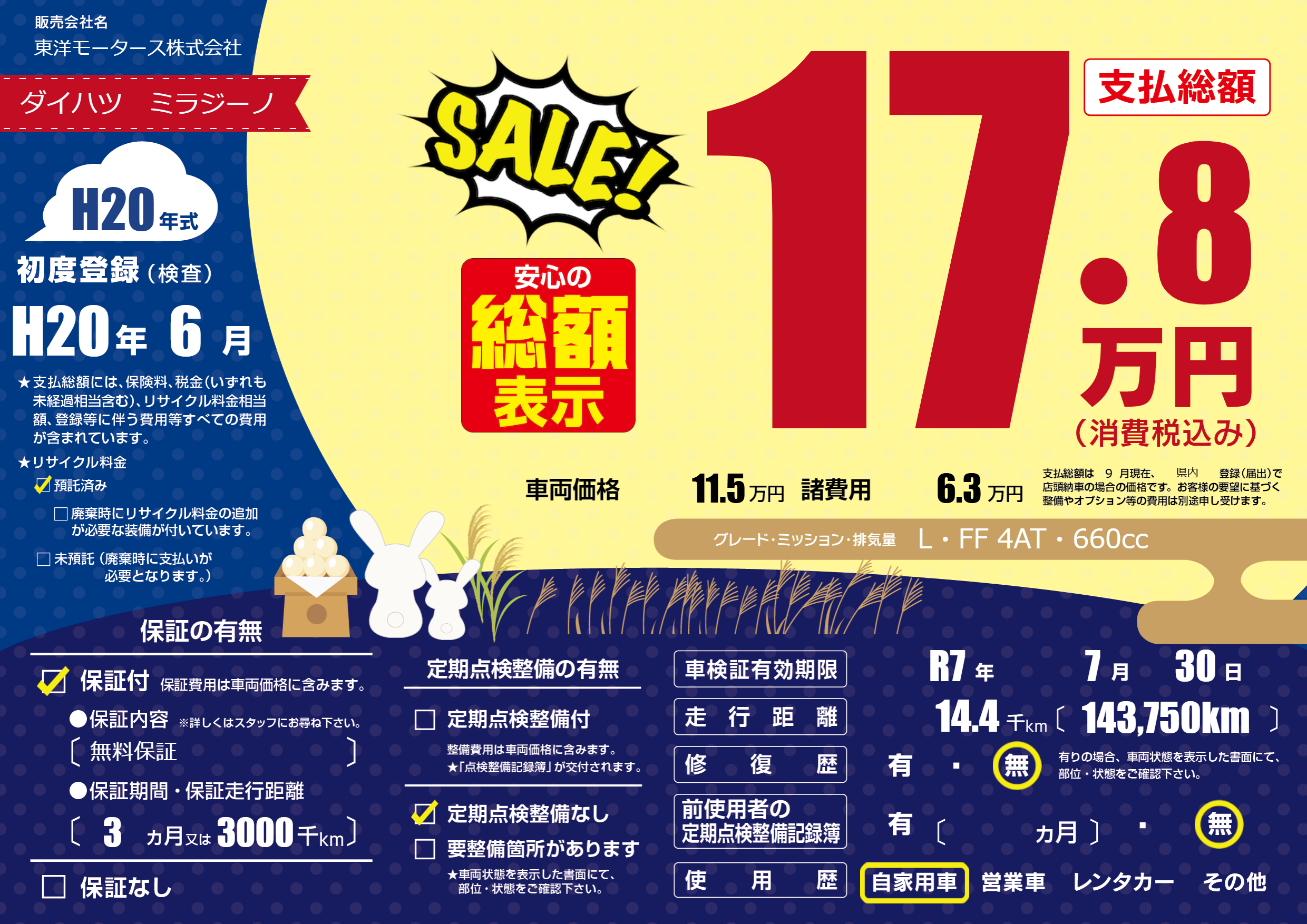 | 車名 | ダイハツ ミラジーノ | グレード ミッション 排気量 |