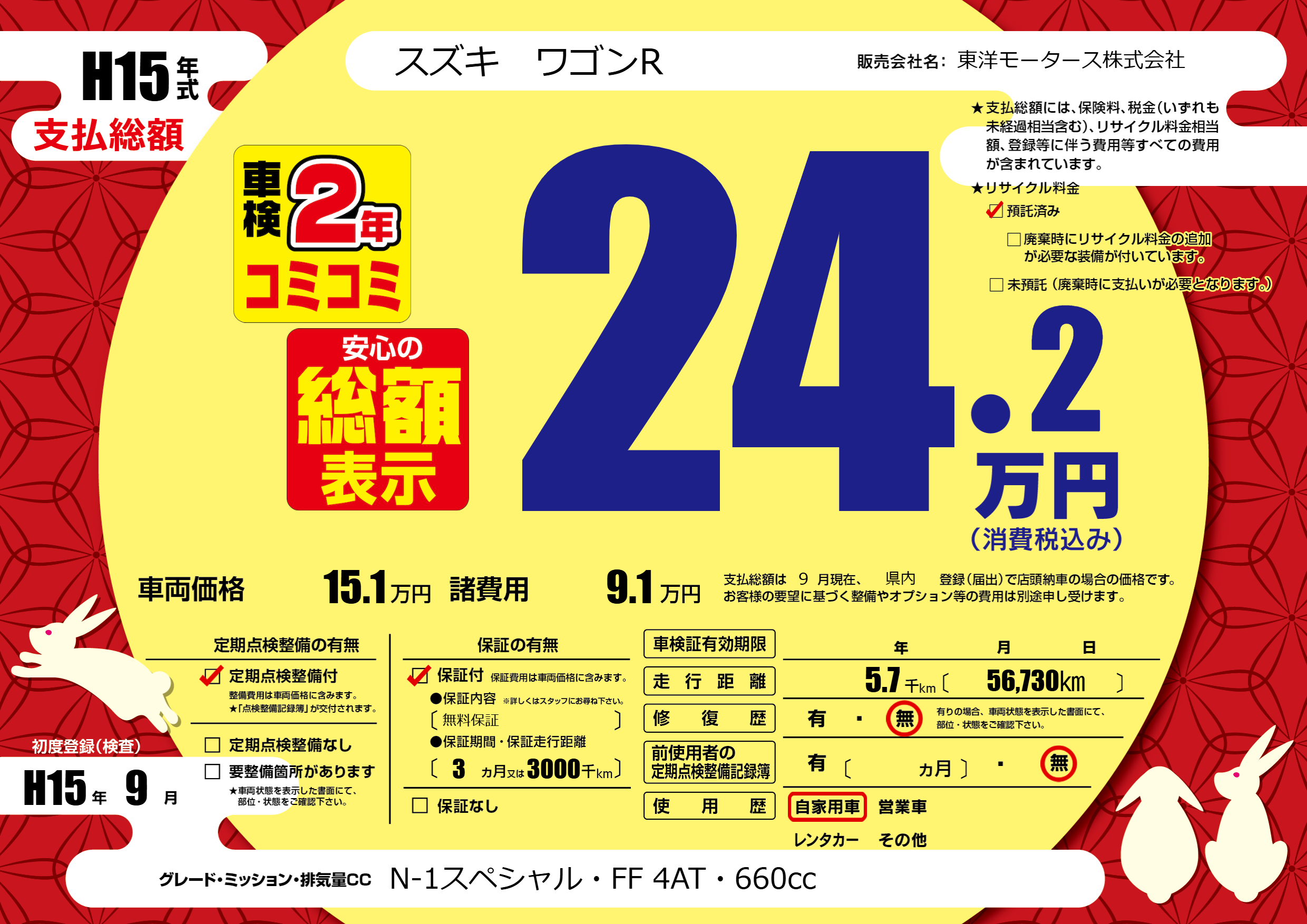 | 車名 | スズキ ワゴンR | グレード ミッション 排気量 |