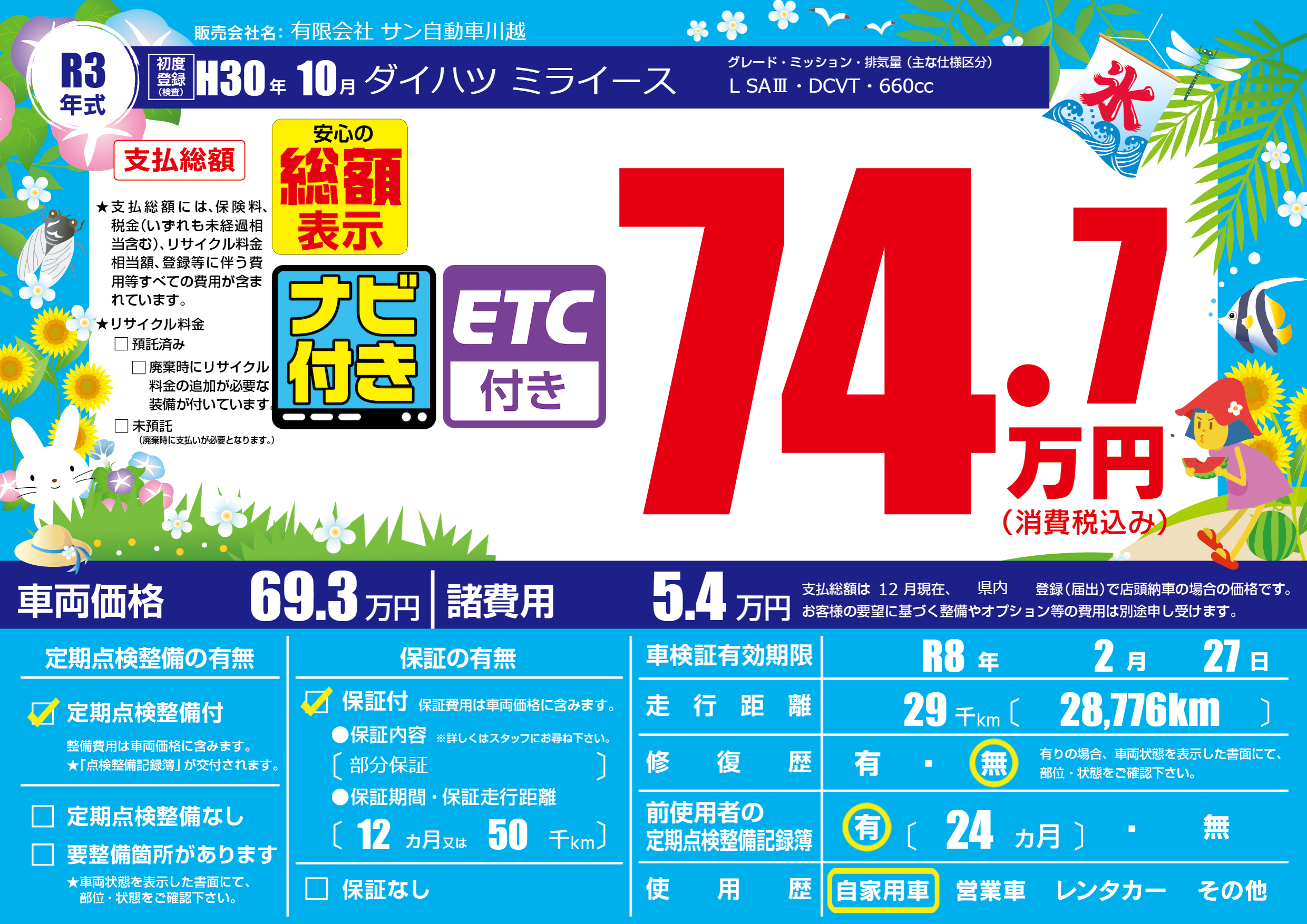 | 車名 | ダイハツ ミライース | グレード ミッション 排気量 |