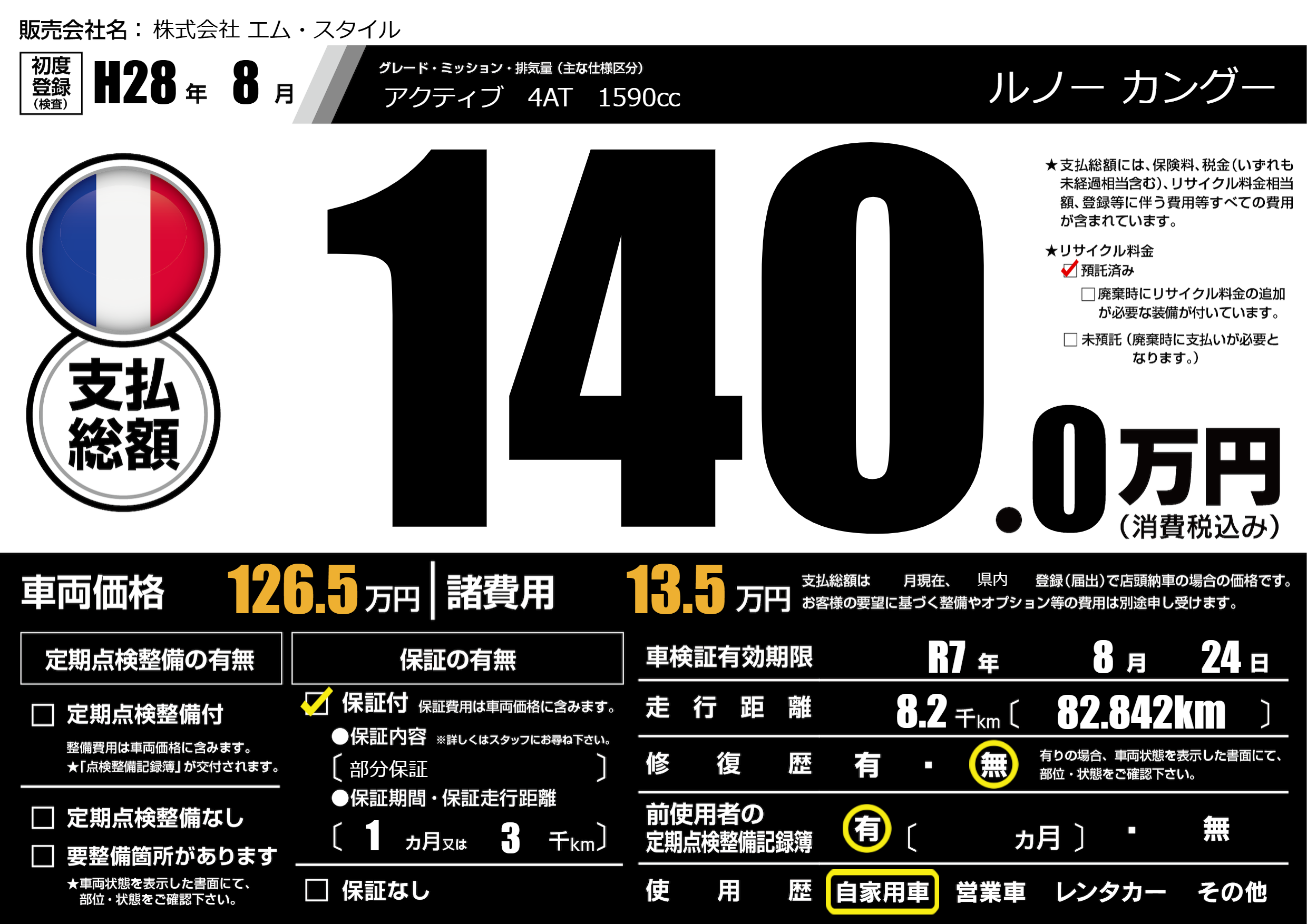 | 車検制限 | R7年 8月 24日 | ||