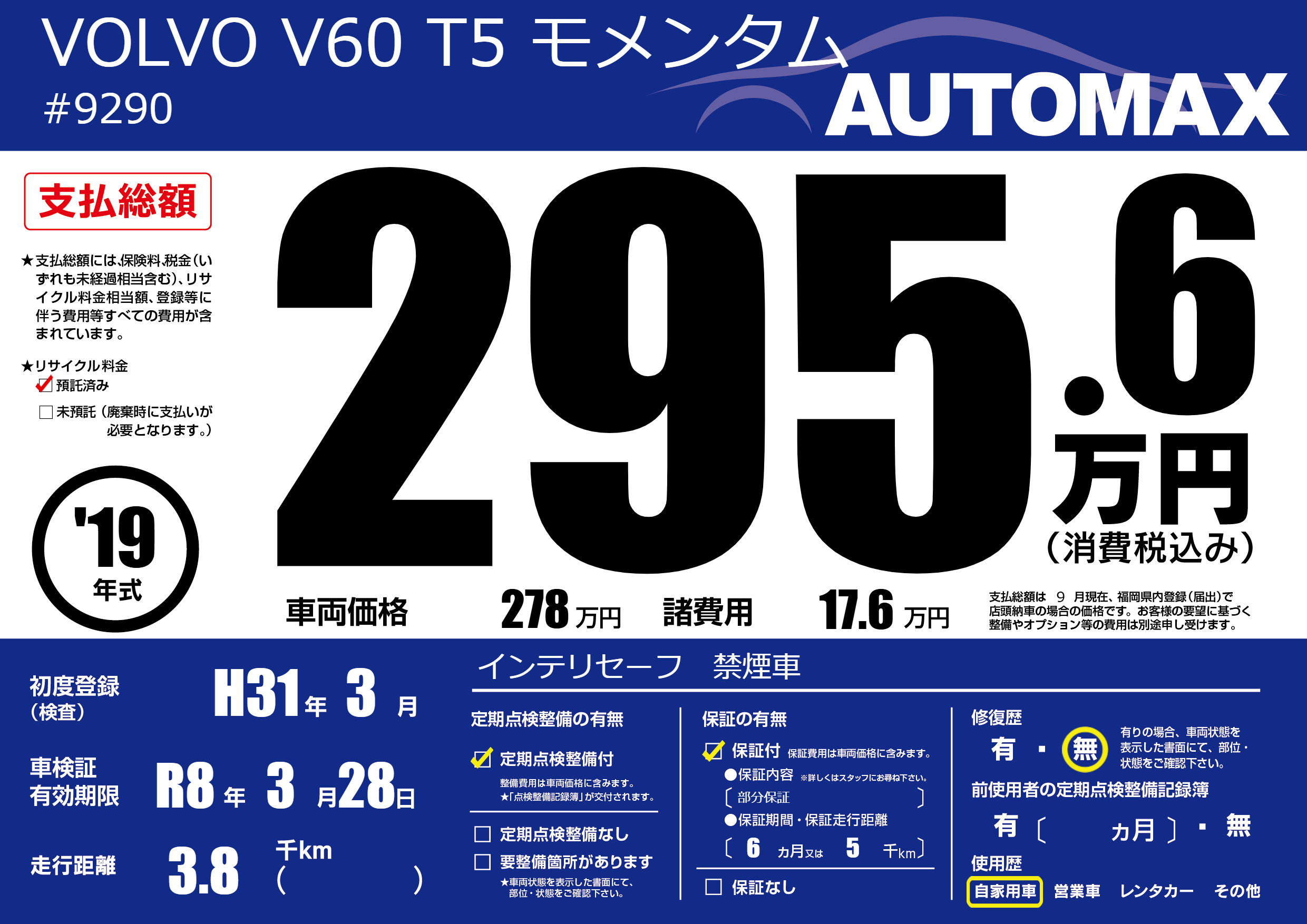 | 車名 | VOLVO V60 T5 モメンタム | グレード ミッション 排気量 |