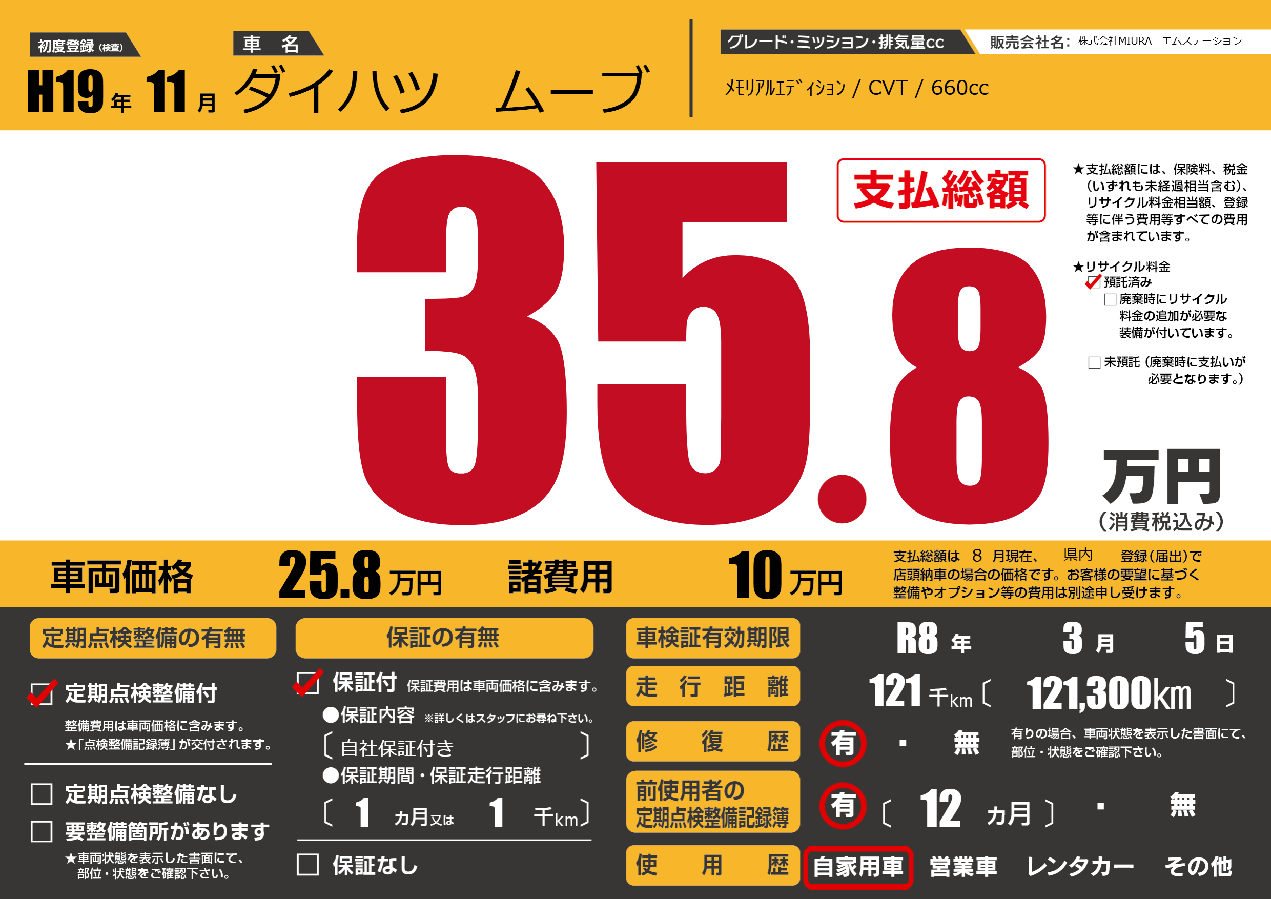 | 走行キロ | 12.1万km | 初年度登録 | H19年11月 |