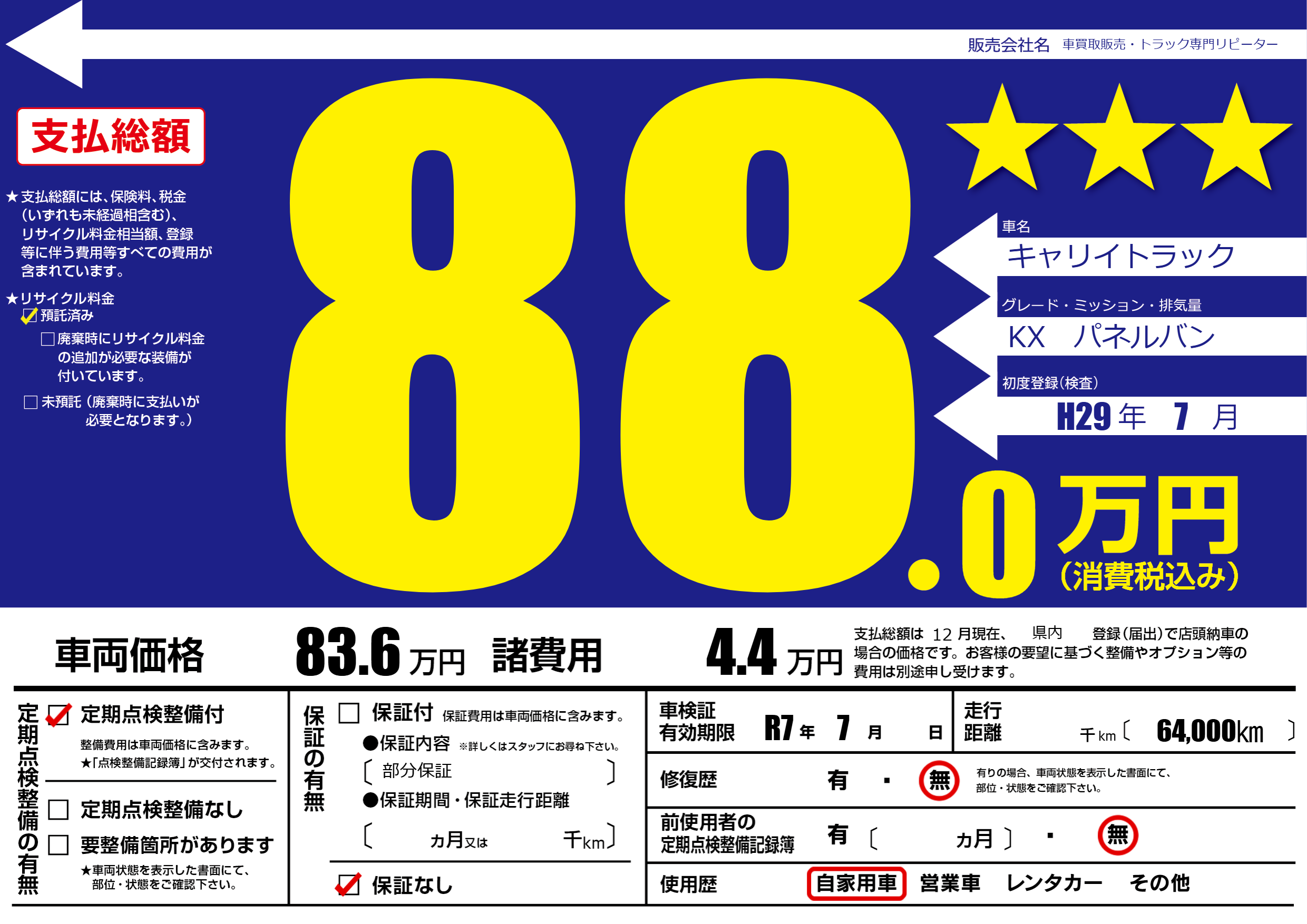 保証なし 保証内容(部分保証) ---ヶ月または()千kmまで |