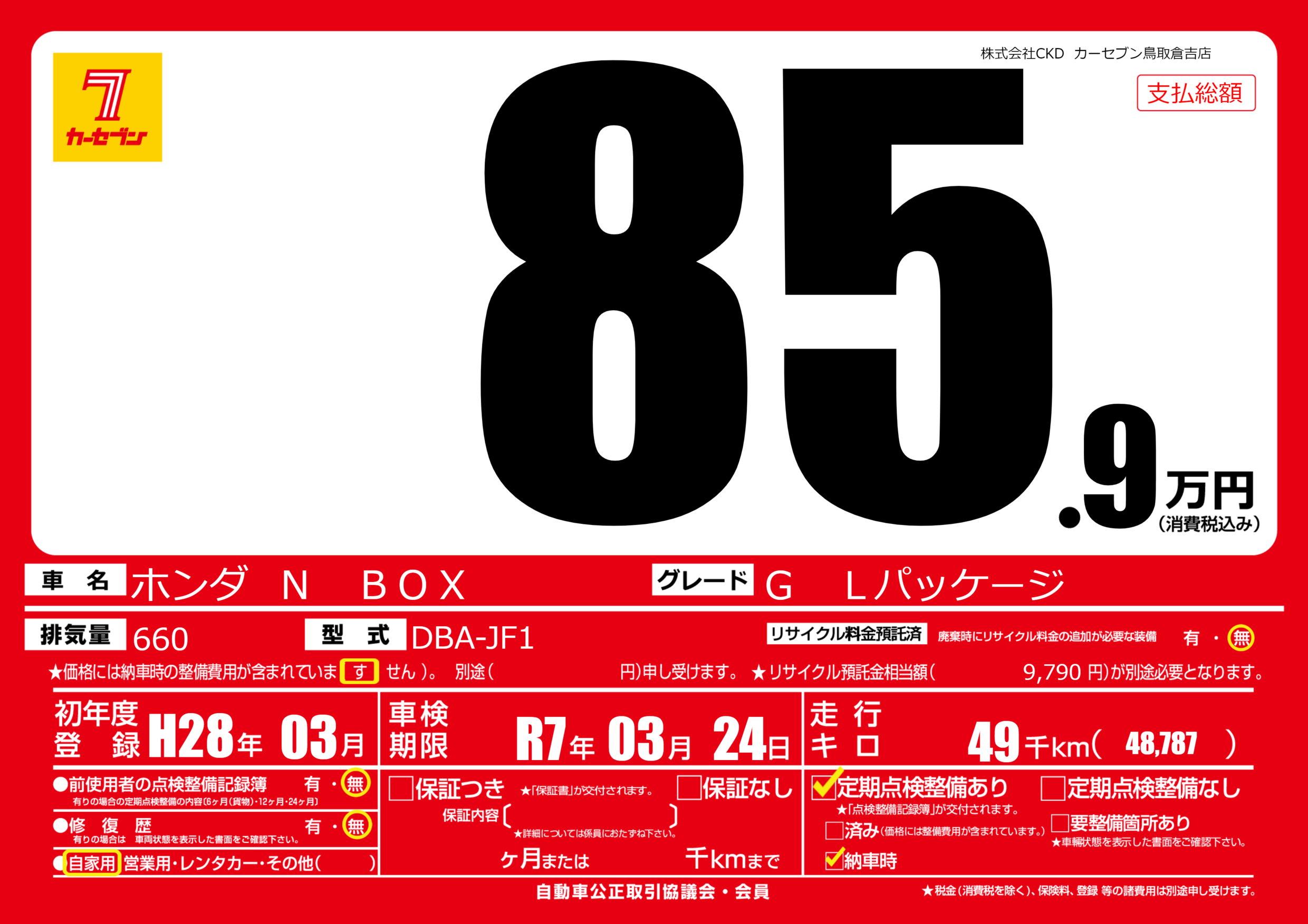 | 定期点検整備 | 定期点検整備あり 納車時あり | ||
