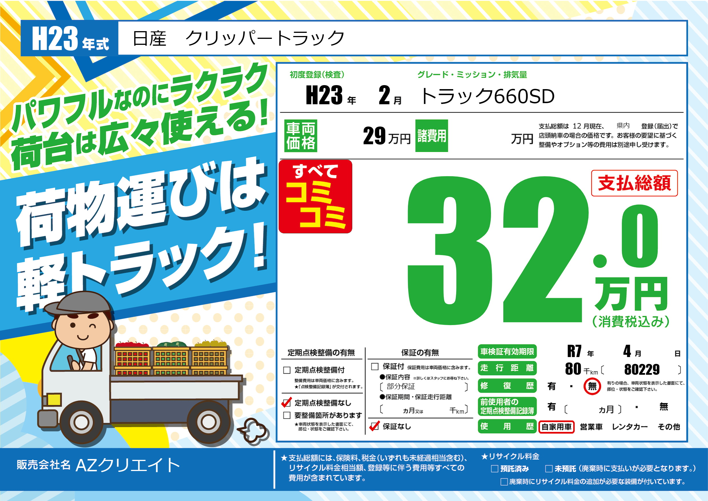 | 車名 | 日産 クリッパートラック | グレード ミッション 排気量 |