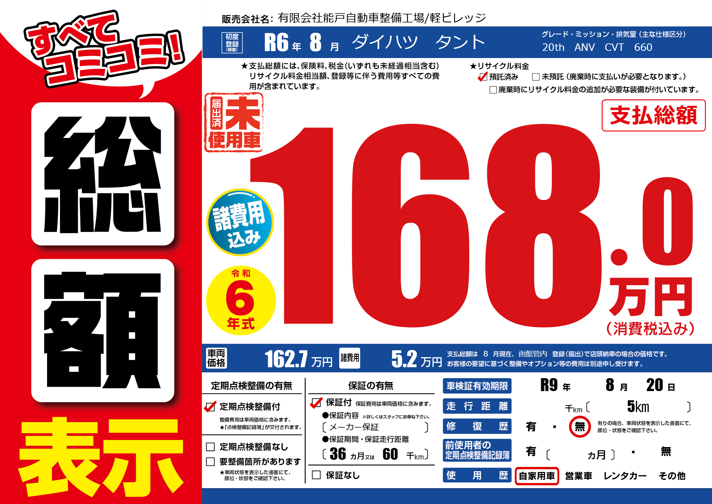 | 車名 | ダイハツ タント | グレード ミッション 排気量 |