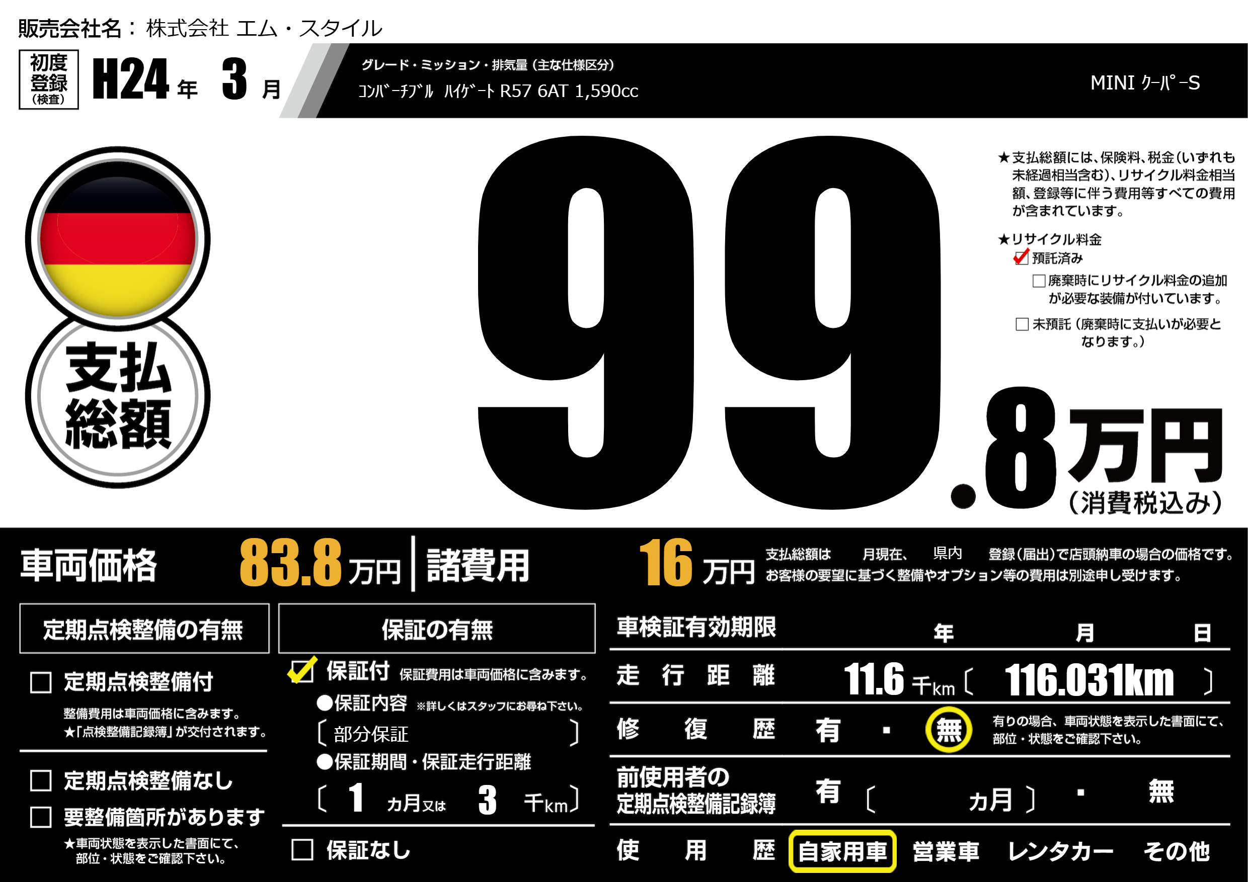 | 車名 | MINI クーパーS | グレード ミッション 排気量 |