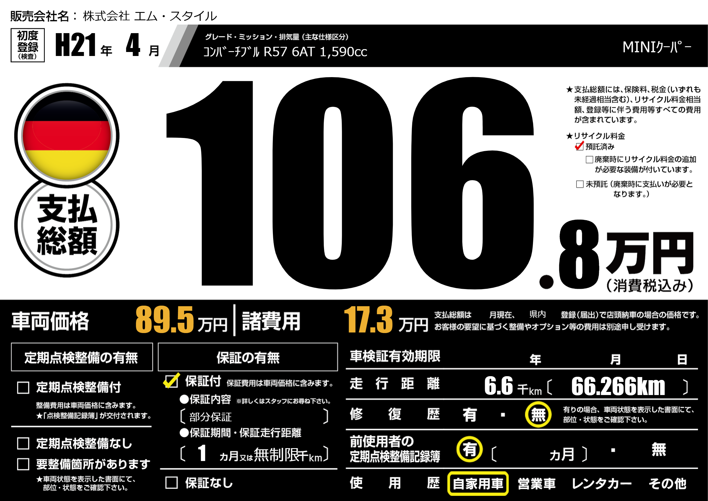 | 車名 | MINIクーパー | グレード ミッション 排気量 |