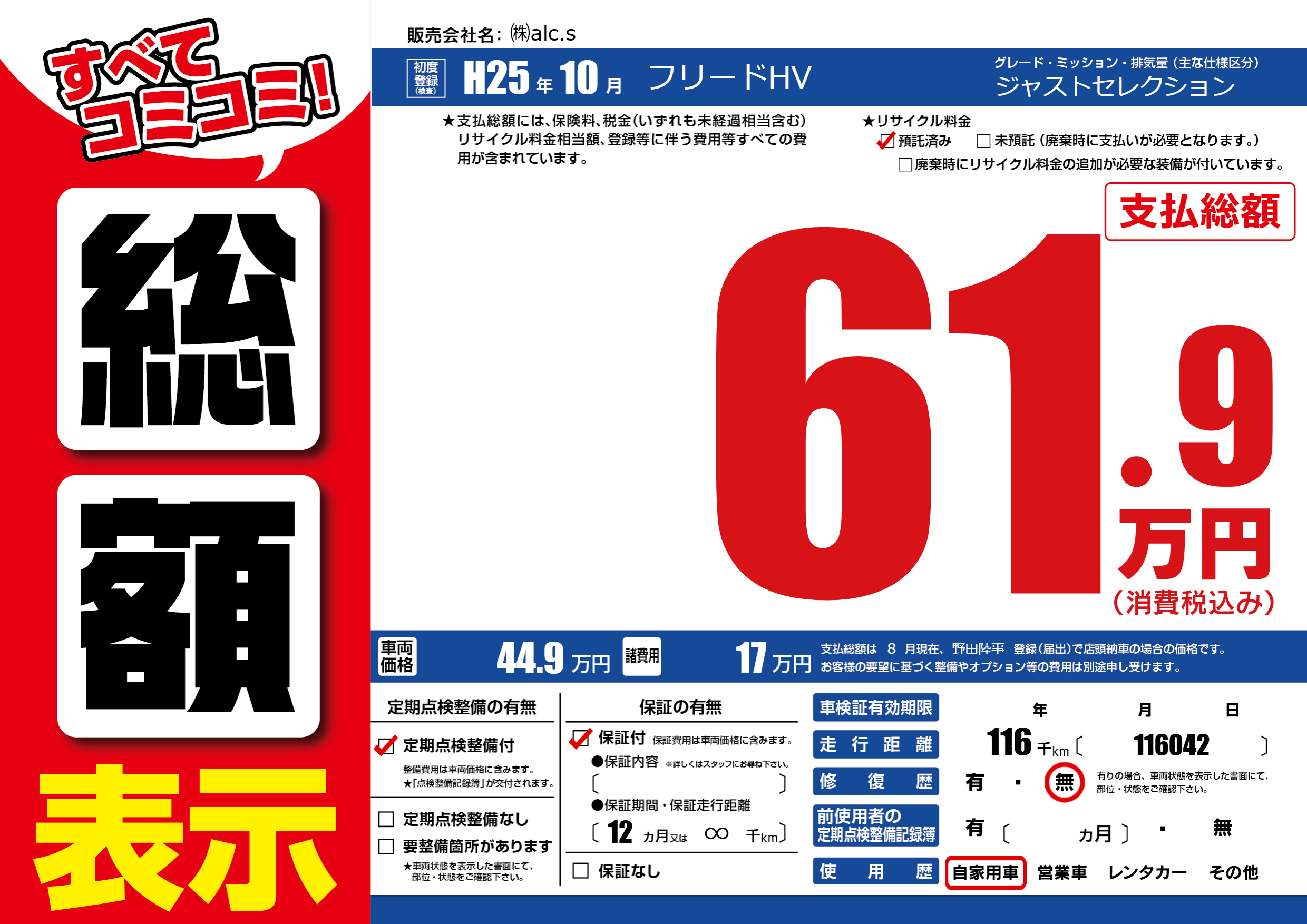 | 走行キロ | 11.6万km | 初年度登録 | H25年10月 |