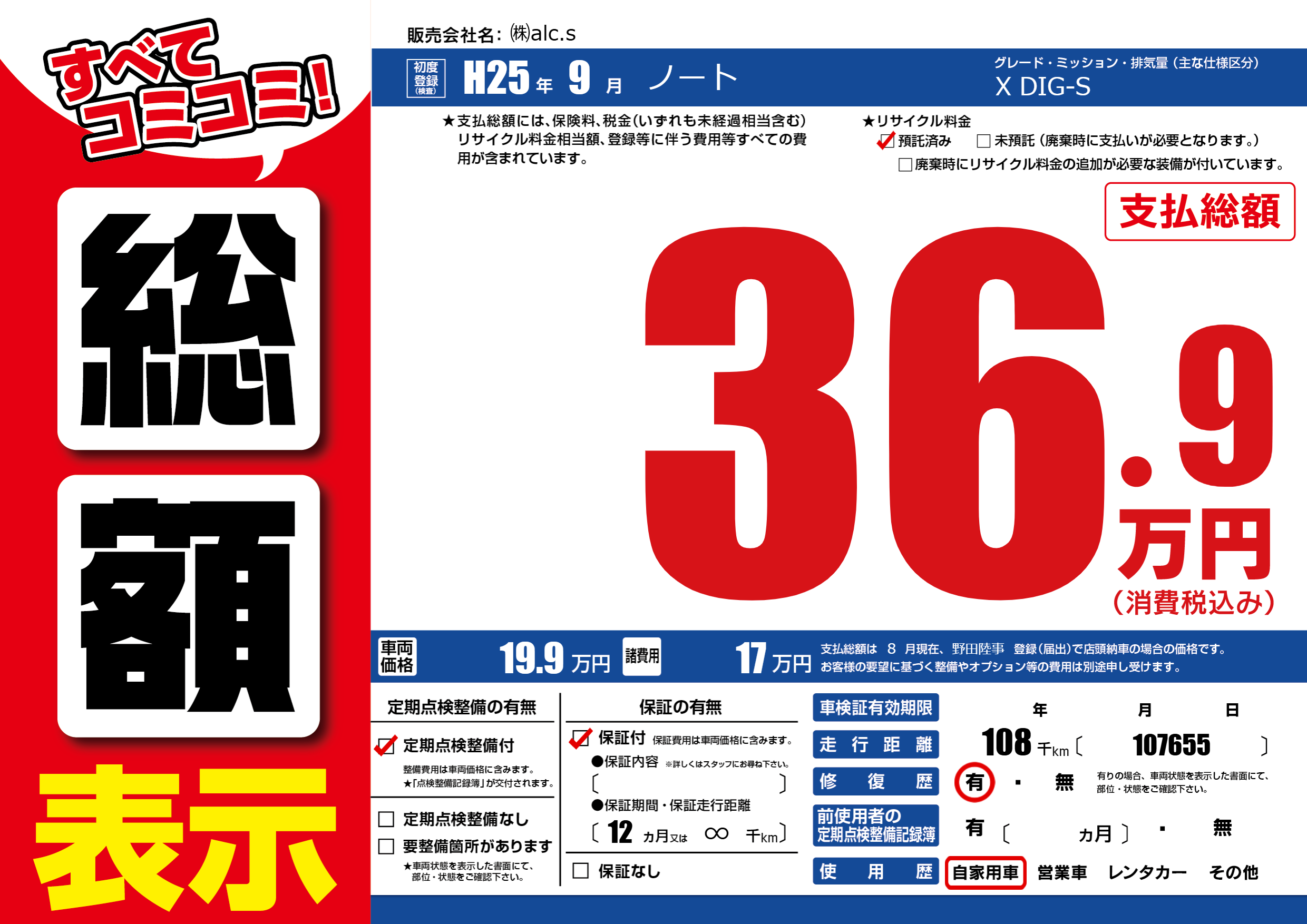 | 走行キロ | 10.8万km | 初年度登録 | H25年9月 |