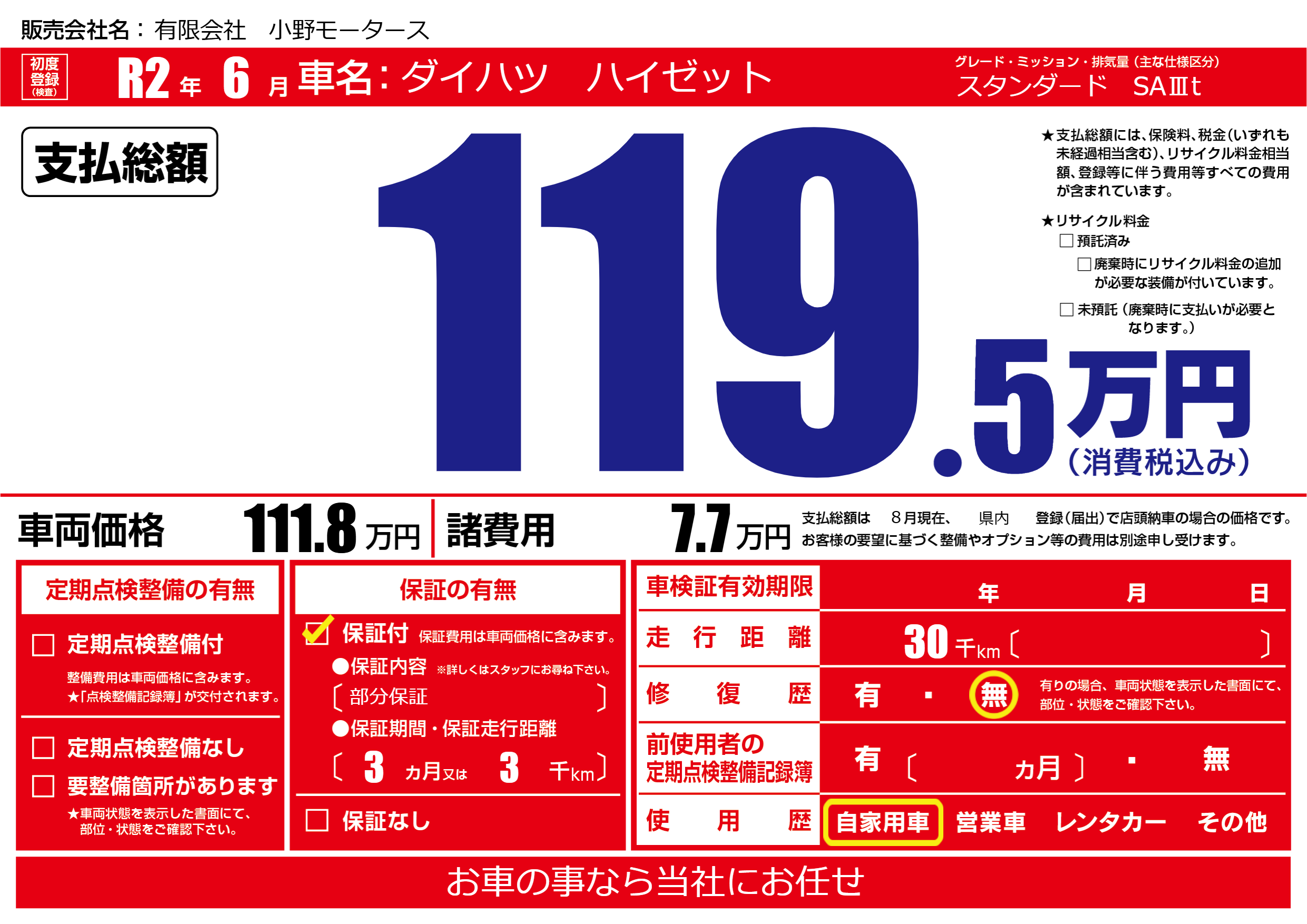保証付き 保証内容(部分保証) 3ヶ月または(3)千kmまで |