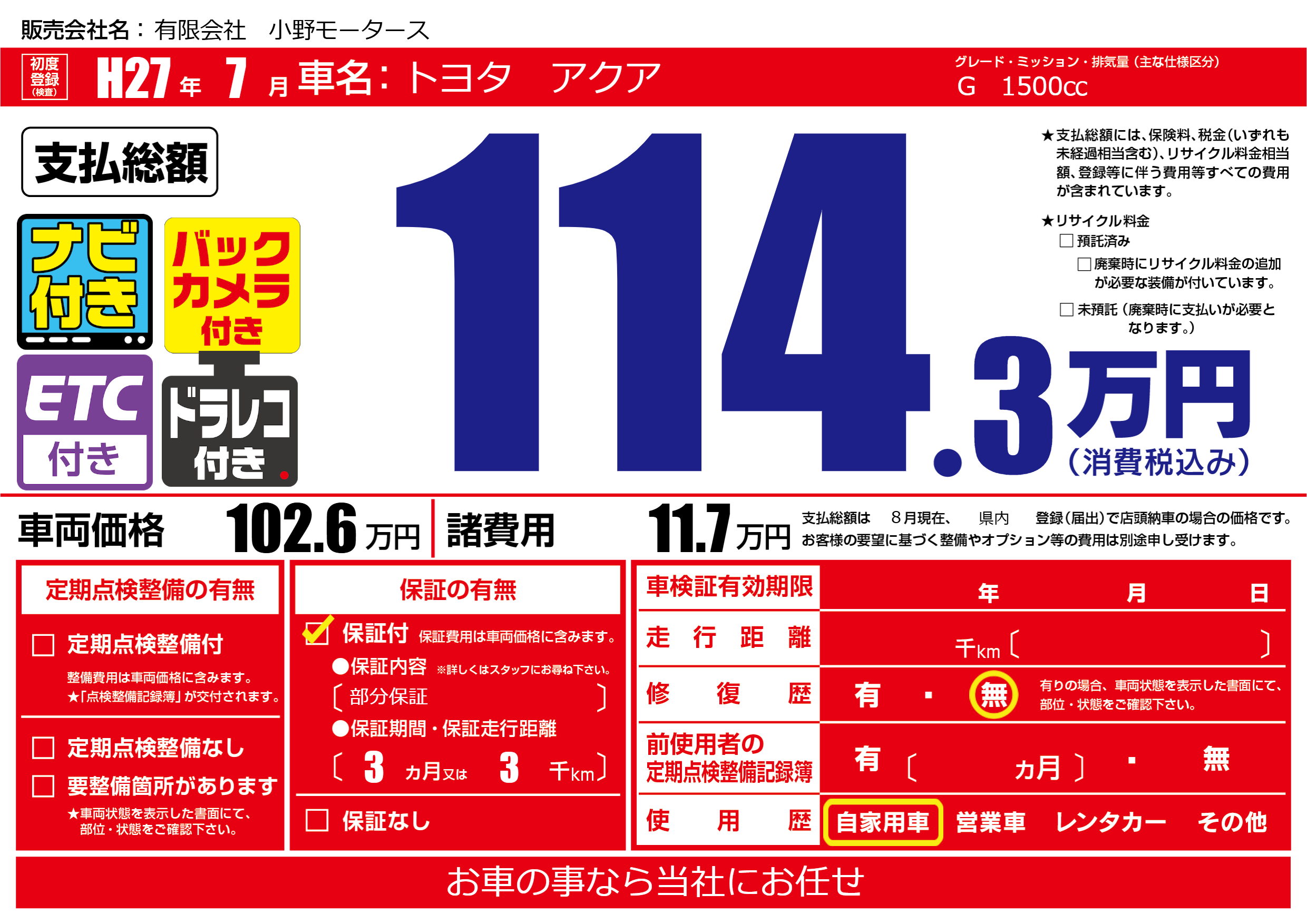 | 車名 | トヨタ アクア | グレード ミッション 排気量 |