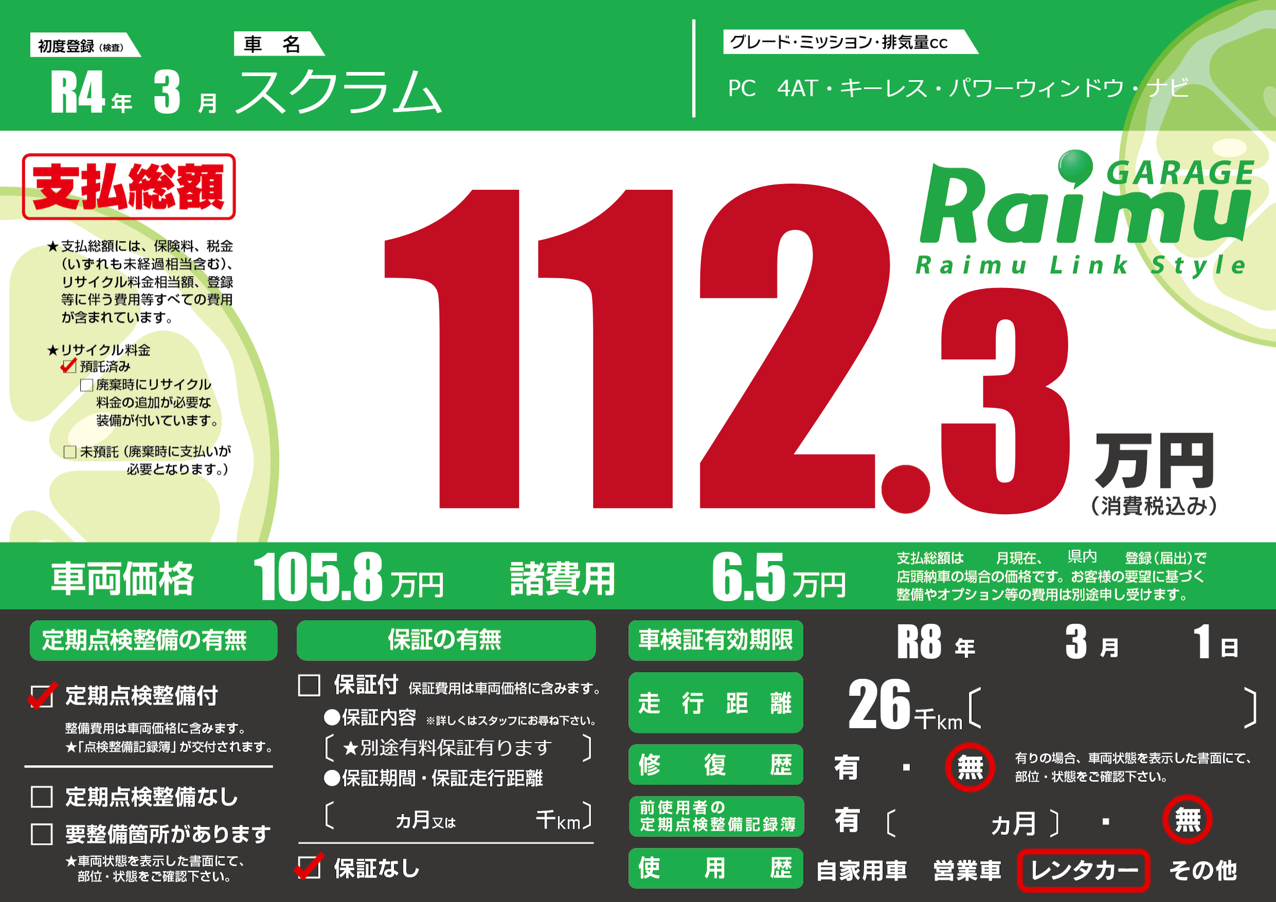 | 車名 | スクラム | グレード ミッション 排気量 |