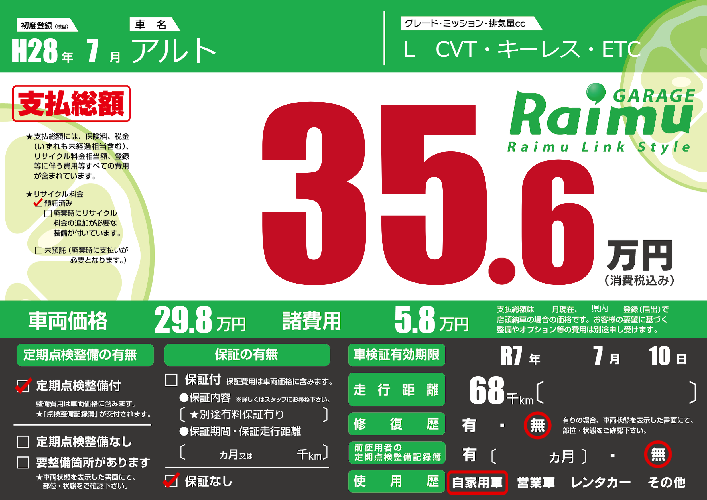 保証なし 保証内容(★別途有料保証有り) ---ヶ月または()千kmまで |