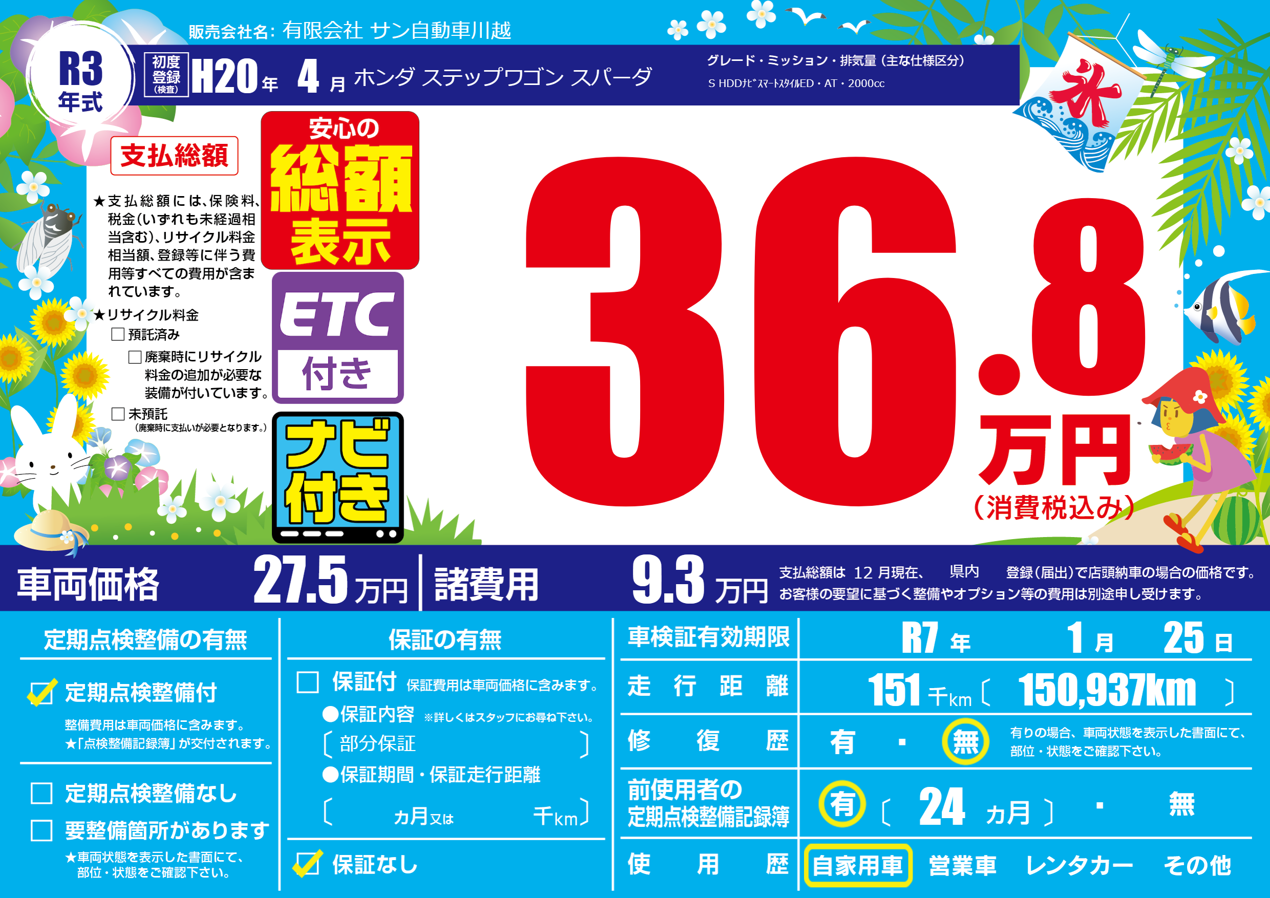 | 車名 | ホンダ ステップワゴン スパーダ | グレード ミッション 排気量 |