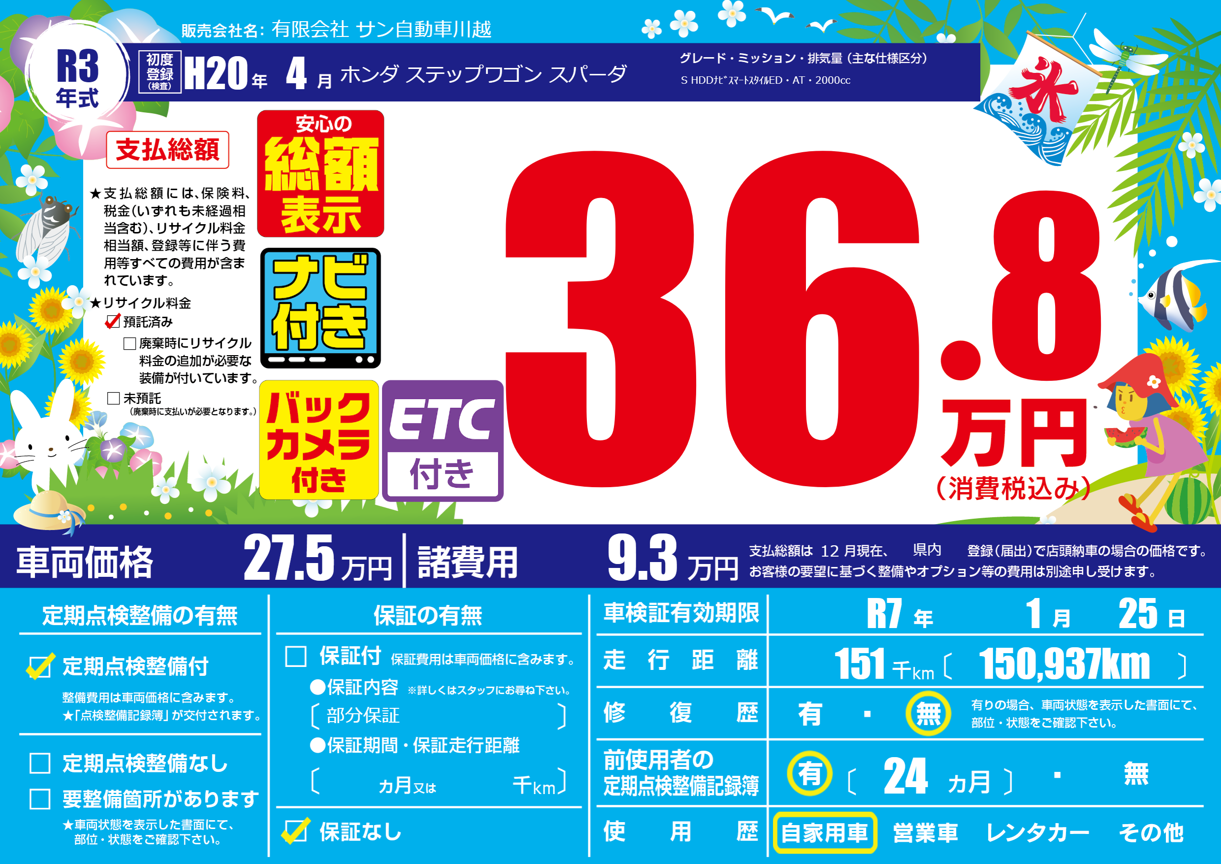 | 車名 | ホンダ ステップワゴン スパーダ | グレード ミッション 排気量 |
