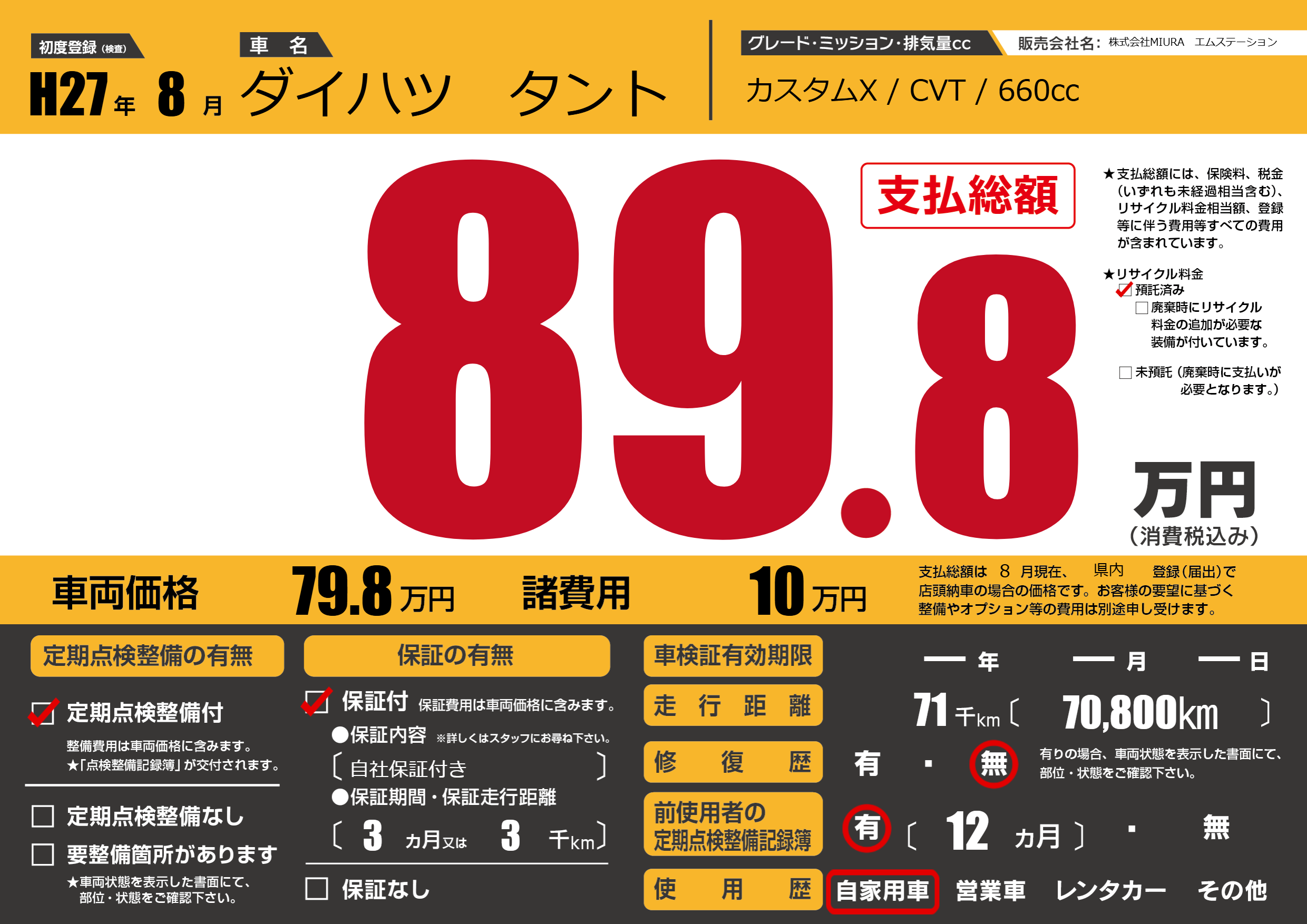 | 車名 | ダイハツ タント | グレード ミッション 排気量 |