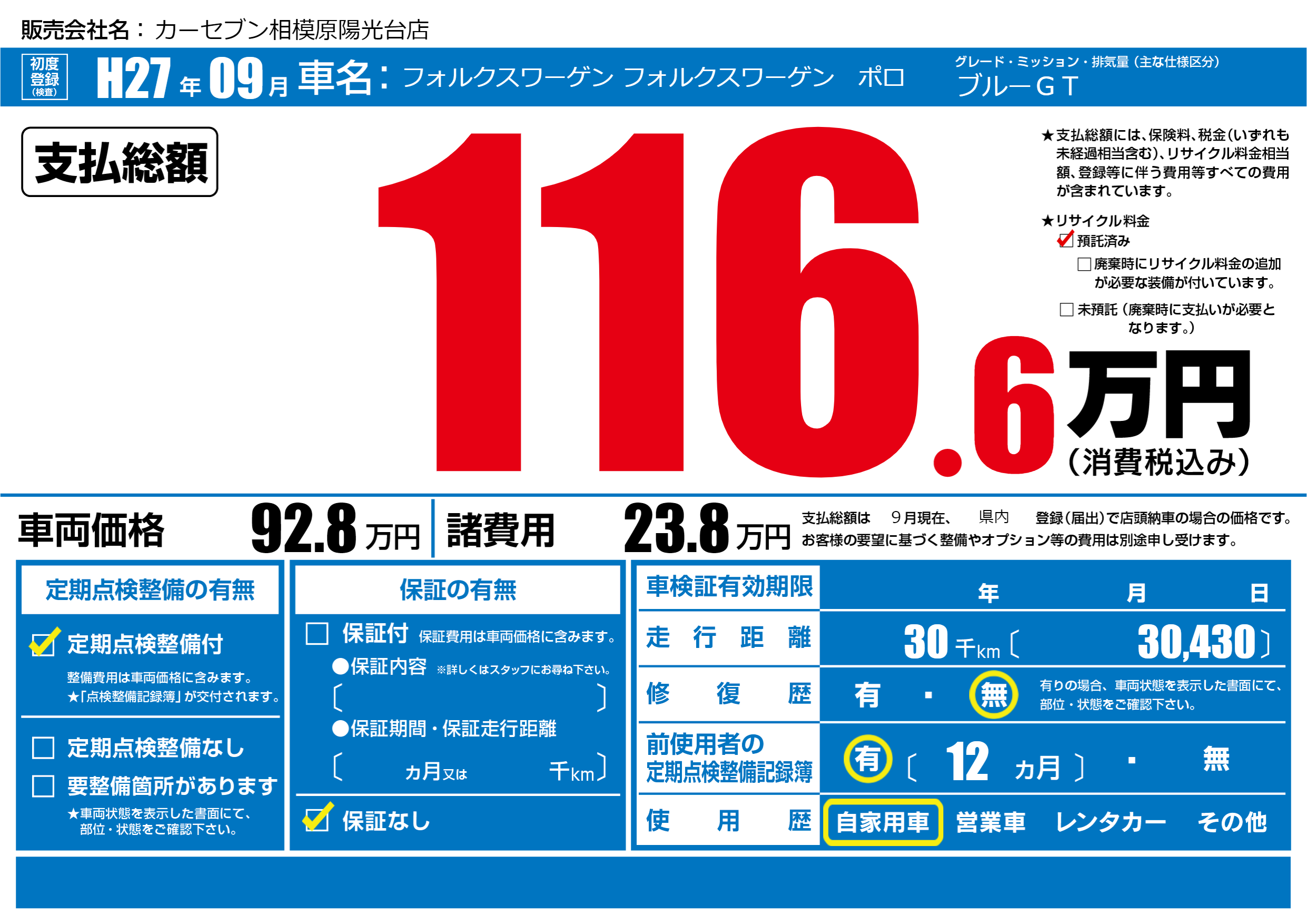 | 車名 | フォルクスワーゲン フォルクスワーゲン ポロ | グレード ミッション 排気量 |