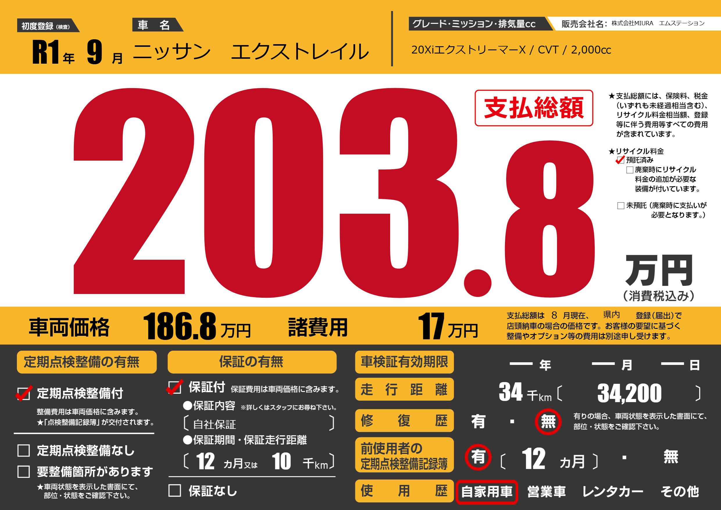 | 車名 | ニッサン エクストレイル | グレード ミッション 排気量 |