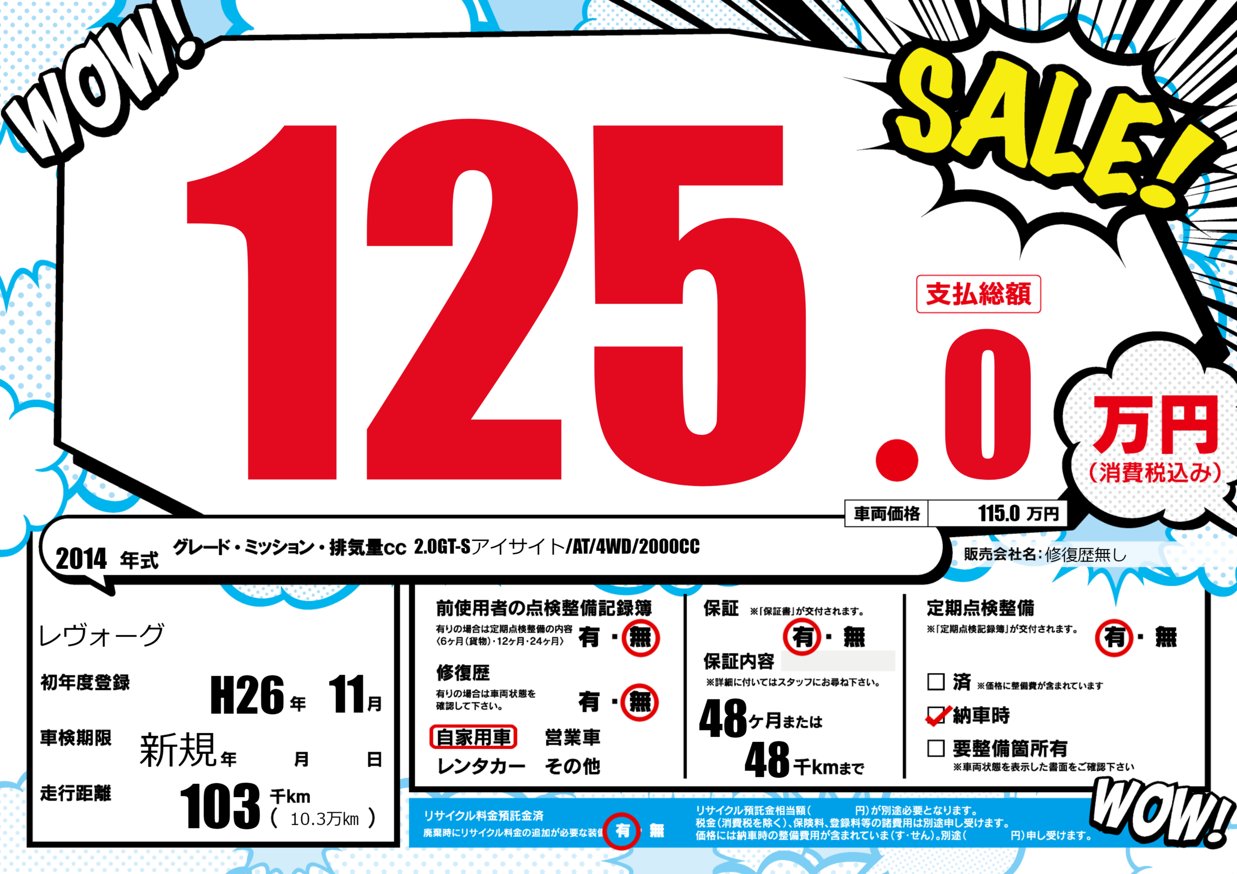 | 車名 | レヴォーグ | グレード ミッション 排気量 |