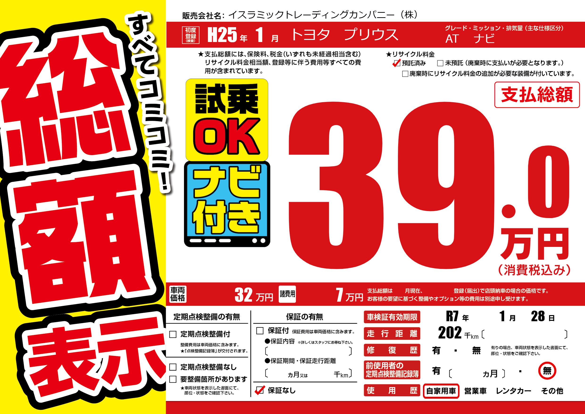 | 車名 | トヨタ プリウス | グレード ミッション 排気量 |
