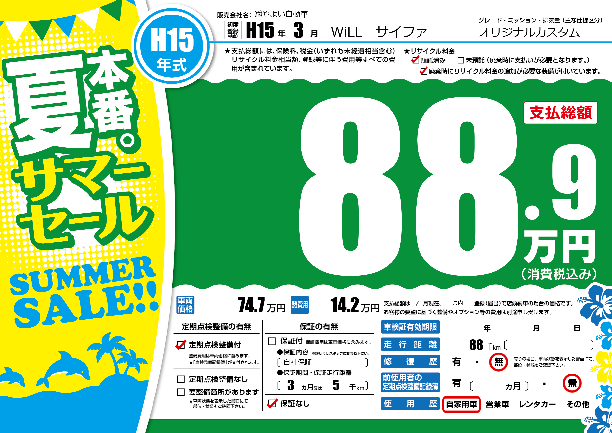 | 走行キロ | 8.8万km | 初年度登録 | H15年3月 |