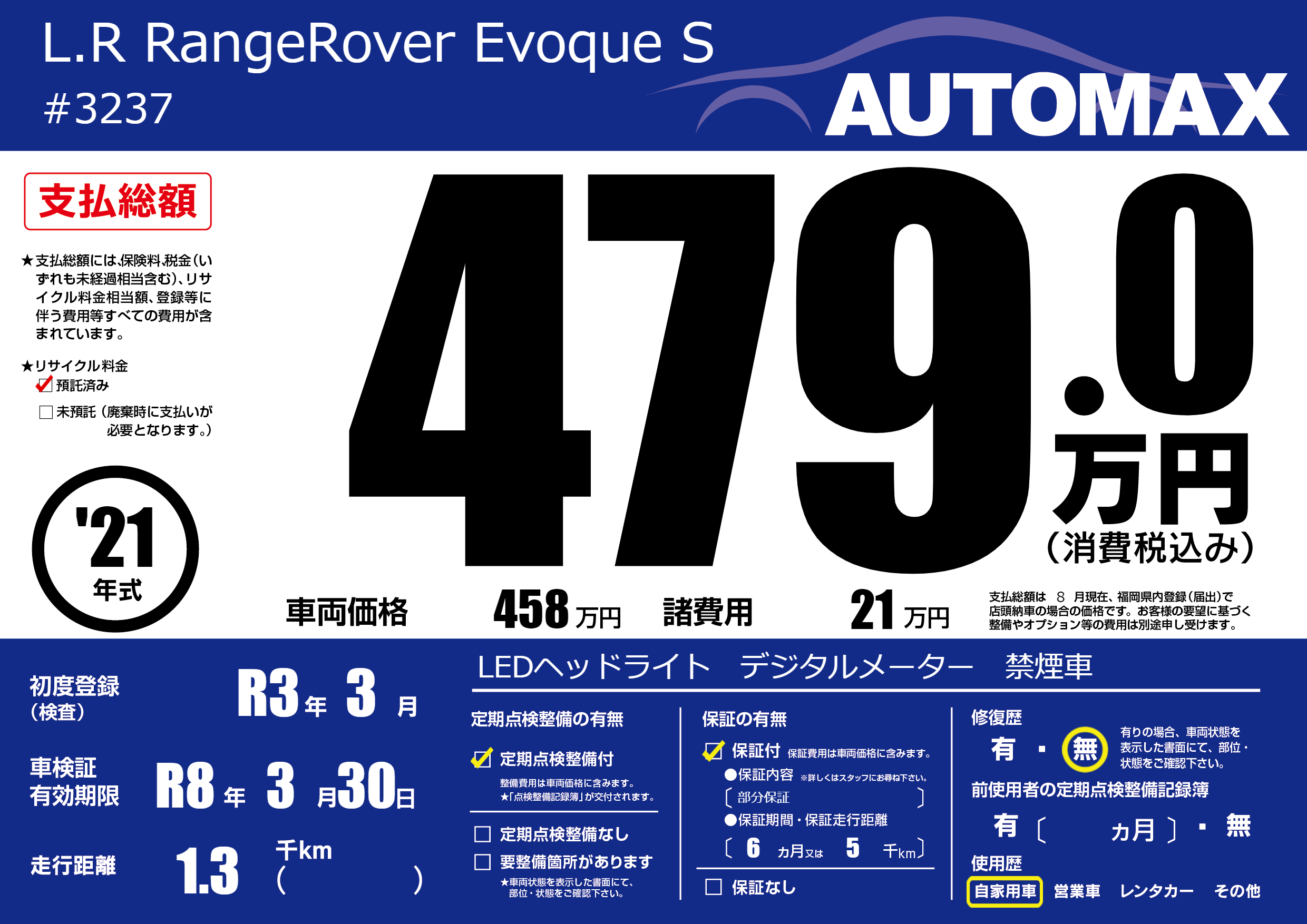 | 車名 | L.R RangeRover Evoque S | グレード ミッション 排気量 |