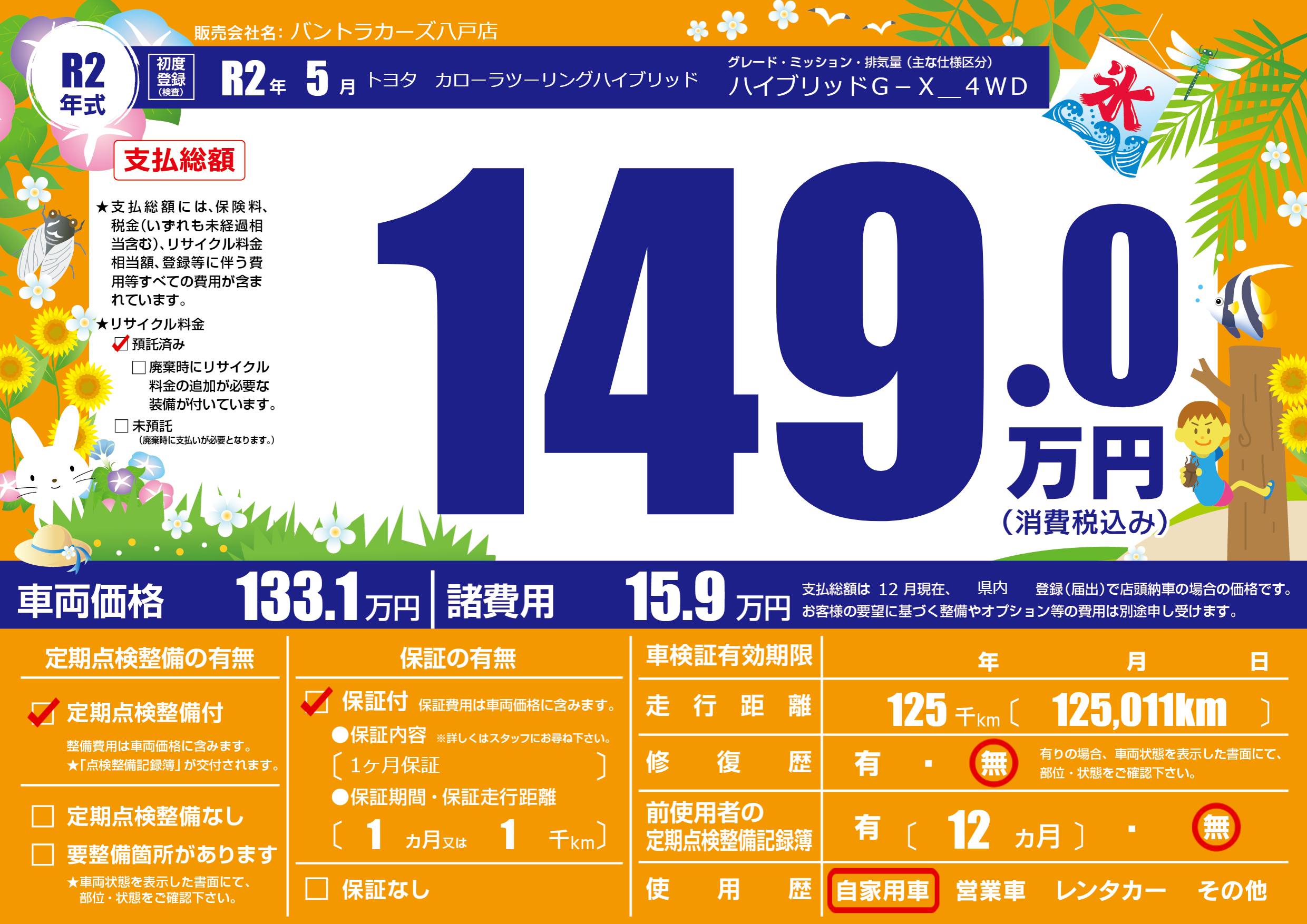 | 走行キロ | 12.5万km | 初年度登録 | R2年5月 |