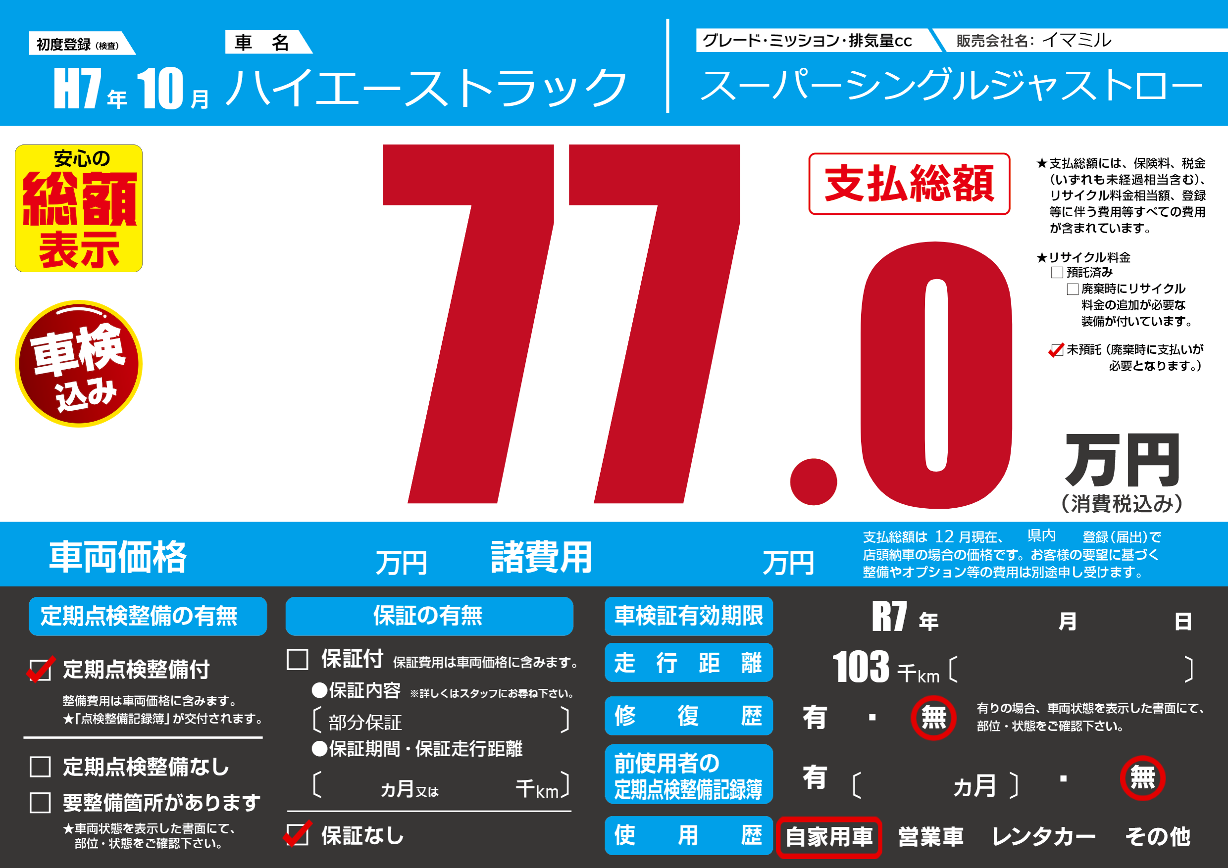 | 走行キロ | 10.3万km | 初年度登録 | H7年10月 |