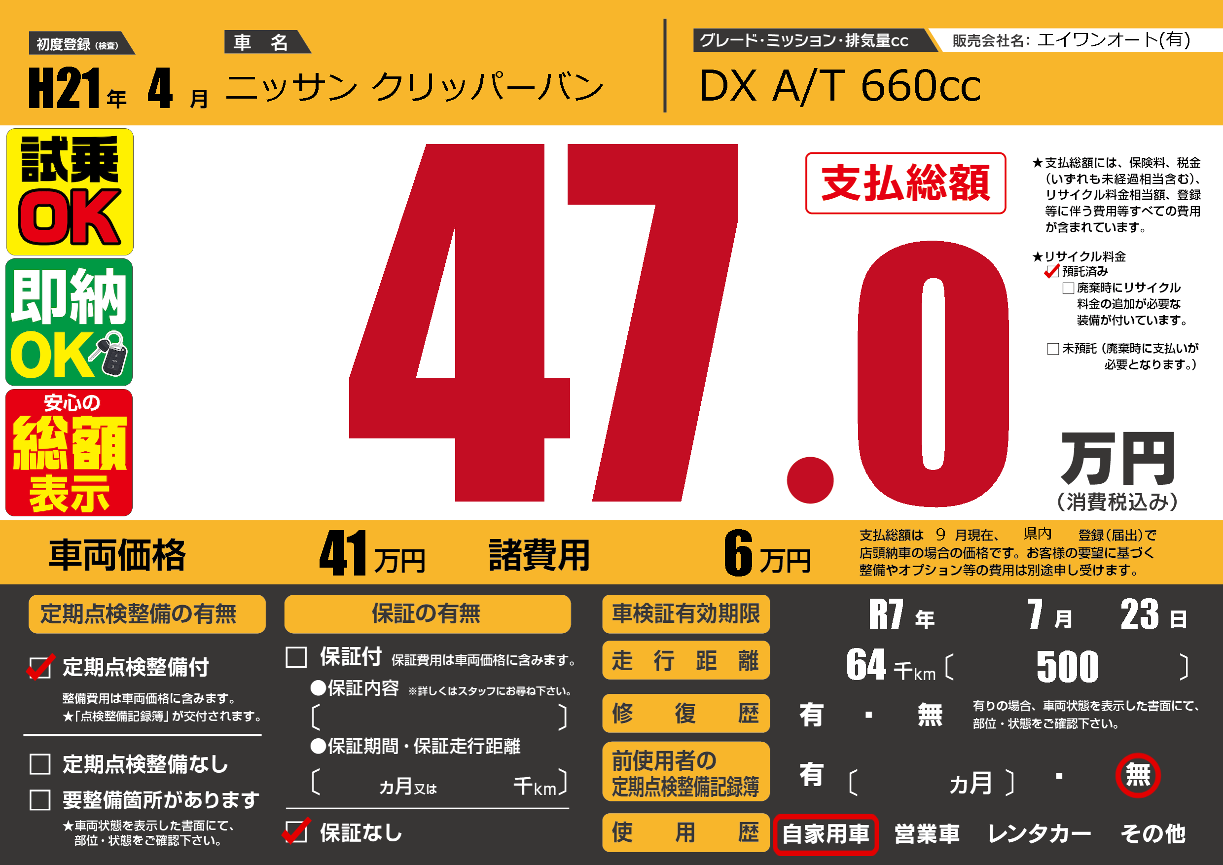 | 車名 | ニッサン クリッパーバン | グレード ミッション 排気量 |