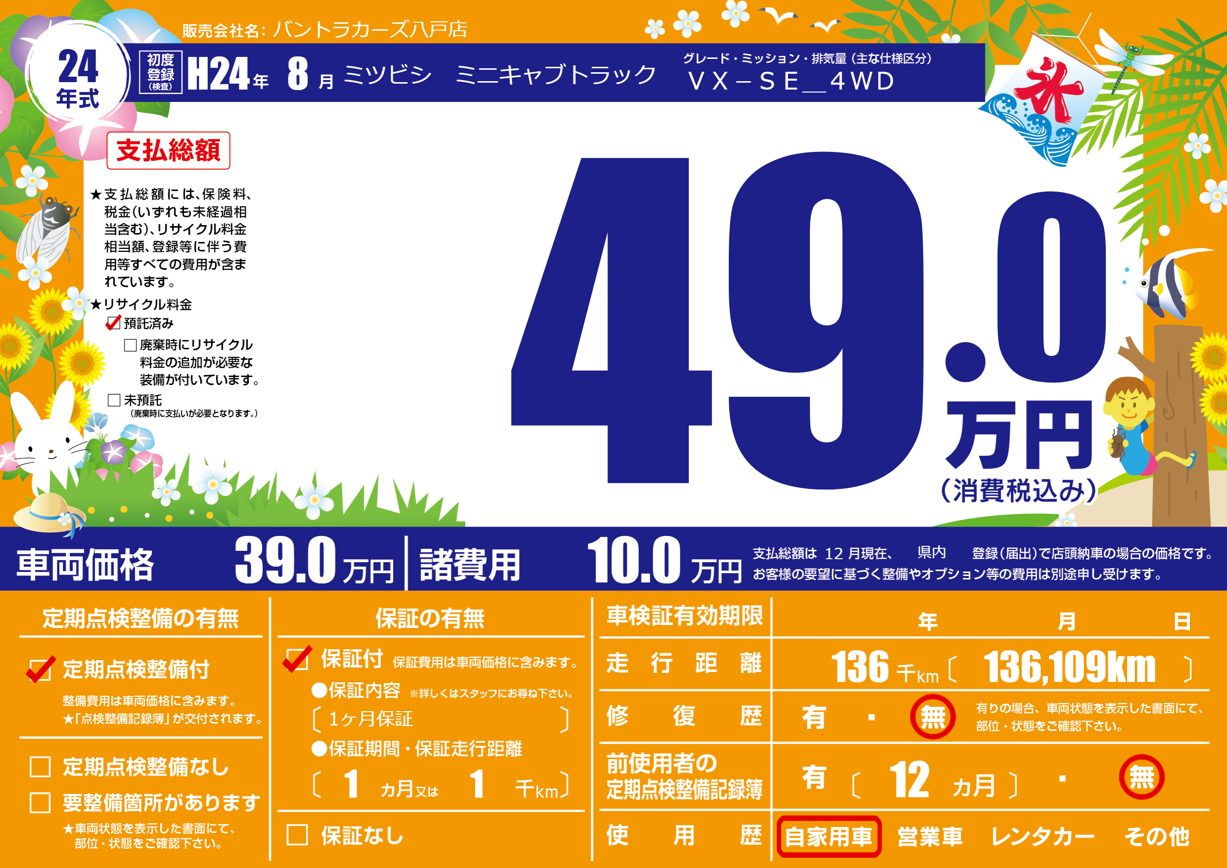 | 走行キロ | 13.6万km | 初年度登録 | H24年8月 |