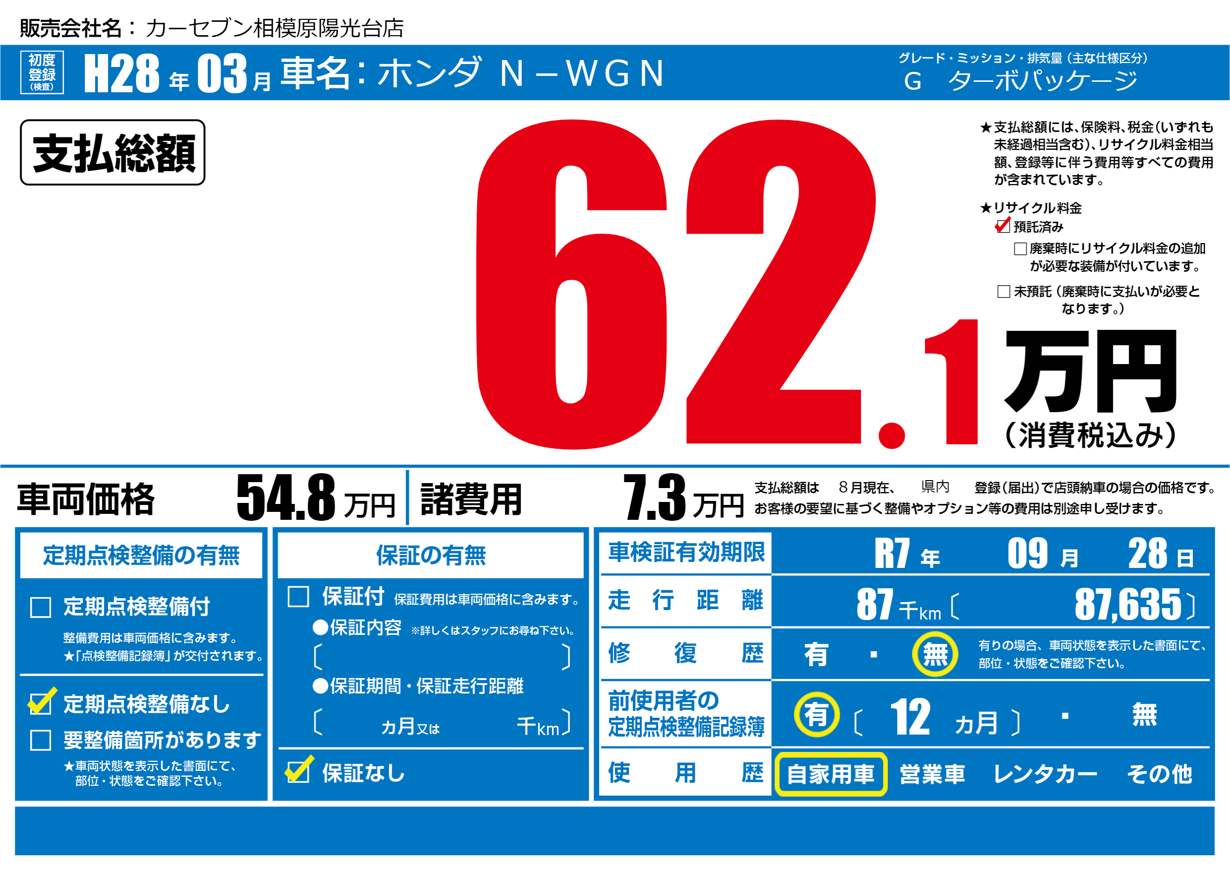 | 車名 | ホンダ N-WGN | グレード ミッション 排気量 |